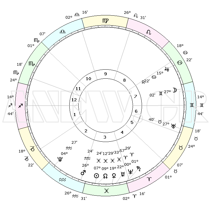 | | ΘΕΣΕΙΣ ΠΛΑΝΗΤΩΝ ΑΣΤΡΟΛΟΓΙΚΟΥ ΧΑΡΤΗ ΤΗΣ ΣΤΙΓΜΗΣ ΑΥΤΗΣ | | | | Πλανήτης | Ζώδιο | Μοίρες | Δεκαήμ. | Σε οίκο | Απόκλιση | | Ακμές των οίκων | | Ηλιος | Ιχθείς | 07°21' | Πρώτο | 3 | 08 S 49 | | 1ος | 27°37' | Σκορπιός | | Σελήνη | Δίδυμοι | 26°13' | Τρίτο | 7 | 28 N 25 | | 2ος | 28°26' | Τοξότης | | Ερμής | Ιχθείς | 22°33' | Τρίτο | 4 | 00 S 27 | | 3ος | 03°44' | Υδροχόος | | Αφροδίτη | Ιχθείς | 19°25' | Δεύτερο | 4 | 05 S 29 | | 4ος | 09°43' | Ιχθείς | | Αρης | Υδροχόος | 26°21' | Τρίτο | 3 | 13 S 45 | | 5ος | 11°02' | Κριός | | Δίας | Καρκίνος | 15°22'R | Δεύτερο | 8 | 22 N 53 | | 6ος | 06°25' | Ταύρος | | Κρόνος | Κριός | 01°29' | Πρώτο | 4 | 01 S 22 | | 7ος | 27°37' | Ταύρος | | Ουρανός | Ταύρος | 27°40' | Τρίτο | 7 | 19 N 28 | | 8ος | 28°25' | Δίδυμοι | | Ποσειδώνας | Κριός | 00°56' | Πρώτο | 4 | 00 S 50 | | 9ος | 03°44' | Λέων | | Πλούτωνας | Υδροχόος | 04°27' | Πρώτο | 3 | 22 S 53 | | 10ος | 09°43' | Παρθένος | | Β. Δεσμός | Ιχθείς | 09°12' | Πρώτο | 3 | 08 S 07 | | 11ος | 11°02' | Ζυγός | | Ωροσκόπος | Σκορπιός | 27°37' | Τρίτο | | | 12ος | 06°25' | Σκορπιός | | Μεσουράνημα | Παρθένος | 09°43' | Πρώτο | | | |
