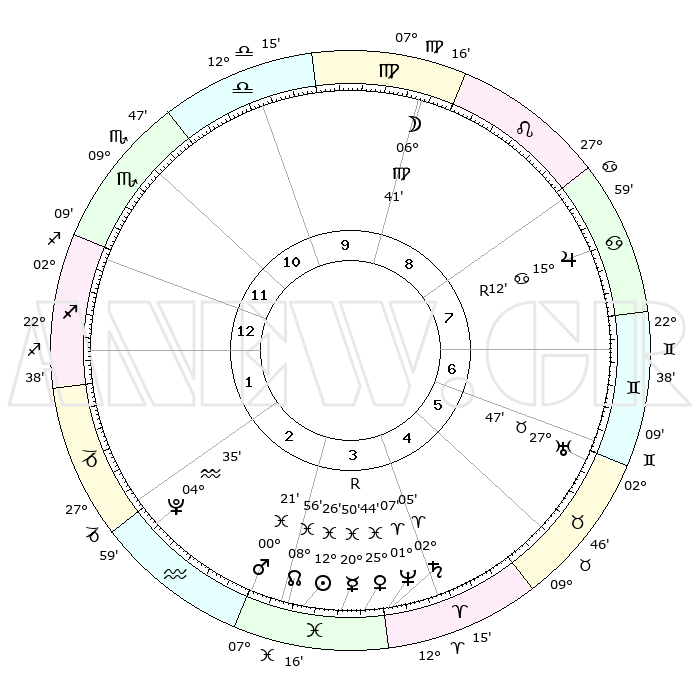 | | ΘΕΣΕΙΣ ΠΛΑΝΗΤΩΝ ΑΣΤΡΟΛΟΓΙΚΟΥ ΧΑΡΤΗ ΤΗΣ ΣΤΙΓΜΗΣ ΑΥΤΗΣ | | | | Πλανήτης | Ζώδιο | Μοίρες | Δεκαήμ. | Σε οίκο | Απόκλιση | | Ακμές των οίκων | | Ηλιος | Ιχθείς | 12°23' | Δεύτερο | 3 | 06 S 55 | | 1ος | 04°16' | Τοξότης | | Σελήνη | Παρθένος | 05°52' | Πρώτο | 9 | 09 N 37 | | 2ος | 06°01' | Αιγόκερως | | Ερμής | Ιχθείς | 20°52'R | Τρίτο | 4 | 00 S 21 | | 3ος | 12°26' | Υδροχόος | | Αφροδίτη | Ιχθείς | 25°40' | Τρίτο | 4 | 02 S 56 | | 4ος | 18°32' | Ιχθείς | | Αρης | Ιχθείς | 00°18' | Πρώτο | 3 | 12 S 23 | | 5ος | 19°00' | Κριός | | Δίας | Καρκίνος | 15°12'R | Δεύτερο | 8 | 22 N 55 | | 6ος | 13°29' | Ταύρος | | Κρόνος | Κριός | 02°04' | Πρώτο | 4 | 01 S 08 | | 7ος | 04°16' | Δίδυμοι | | Ουρανός | Ταύρος | 27°47' | Τρίτο | 6 | 19 N 29 | | 8ος | 06°01' | Καρκίνος | | Ποσειδώνας | Κριός | 01°07' | Πρώτο | 4 | 00 S 45 | | 9ος | 12°26' | Λέων | | Πλούτωνας | Υδροχόος | 04°35' | Πρώτο | 2 | 22 S 52 | | 10ος | 18°32' | Παρθένος | | Β. Δεσμός | Ιχθείς | 08°56' | Πρώτο | 3 | 08 S 13 | | 11ος | 19°00' | Ζυγός | | Ωροσκόπος | Τοξότης | 04°16' | Πρώτο | | | 12ος | 13°29' | Σκορπιός | | Μεσουράνημα | Παρθένος | 18°32' | Δεύτερο | | | |