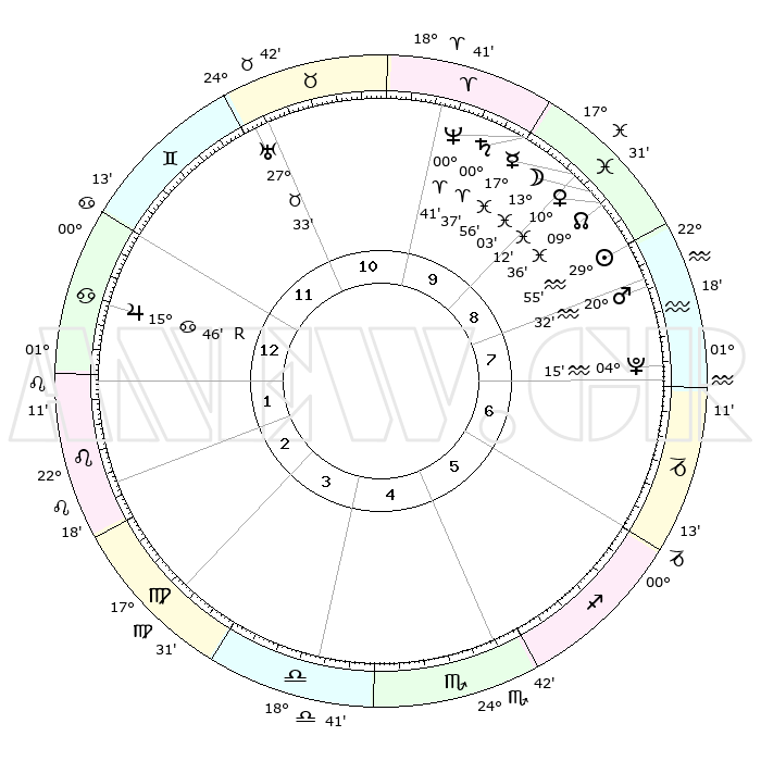 | | ΘΕΣΕΙΣ ΠΛΑΝΗΤΩΝ ΑΣΤΡΟΛΟΓΙΚΟΥ ΧΑΡΤΗ ΤΗΣ ΣΤΙΓΜΗΣ ΑΥΤΗΣ | | | | Πλανήτης | Ζώδιο | Μοίρες | Δεκαήμ. | Σε οίκο | Απόκλιση | | Ακμές των οίκων | | Ηλιος | Υδροχόος | 29°50' | Τρίτο | 9 | 11 S 32 | | 1ος | 09°17' | Καρκίνος | | Σελήνη | Ιχθείς | 12°04' | Δεύτερο | 9 | 06 S 46 | | 2ος | 29°43' | Καρκίνος | | Ερμής | Ιχθείς | 17°51' | Δεύτερο | 9 | 04 S 00 | | 3ος | 22°16' | Λέων | | Αφροδίτη | Ιχθείς | 10°06' | Δεύτερο | 9 | 09 S 08 | | 4ος | 20°07' | Παρθένος | | Αρης | Υδροχόος | 20°29' | Τρίτο | 8 | 15 S 41 | | 5ος | 25°19' | Ζυγός | | Δίας | Καρκίνος | 15°47'R | Δεύτερο | 1 | 22 N 50 | | 6ος | 04°22' | Τοξότης | | Κρόνος | Κριός | 00°37' | Πρώτο | 10 | 01 S 43 | | 7ος | 09°17' | Αιγόκερως | | Ουρανός | Ταύρος | 27°33' | Τρίτο | 11 | 19 N 26 | | 8ος | 29°43' | Αιγόκερως | | Ποσειδώνας | Κριός | 00°41' | Πρώτο | 10 | 00 S 56 | | 9ος | 22°16' | Υδροχόος | | Πλούτωνας | Υδροχόος | 04°14' | Πρώτο | 8 | 22 S 55 | | 10ος | 20°07' | Ιχθείς | | Β. Δεσμός | Ιχθείς | 09°36' | Πρώτο | 9 | 07 S 58 | | 11ος | 25°19' | Κριός | | Ωροσκόπος | Καρκίνος | 09°17' | Πρώτο | | | 12ος | 04°22' | Δίδυμοι | | Μεσουράνημα | Ιχθείς | 20°07' | Τρίτο | | | |