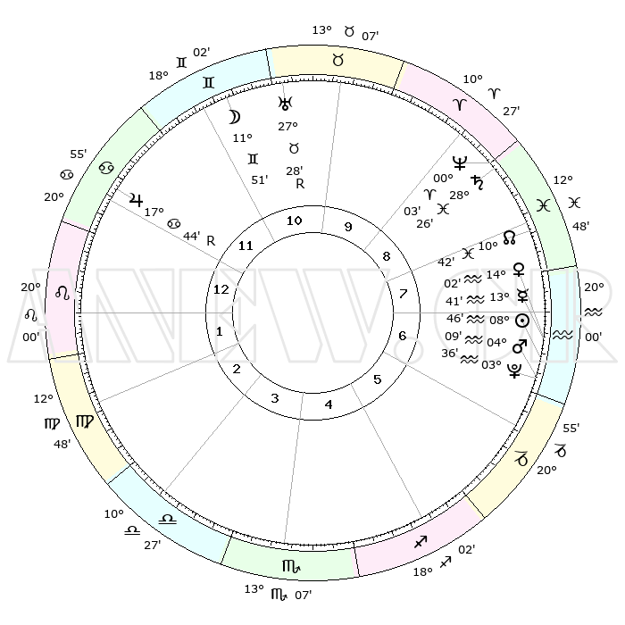 | | ΘΕΣΕΙΣ ΠΛΑΝΗΤΩΝ ΑΣΤΡΟΛΟΓΙΚΟΥ ΧΑΡΤΗ ΤΗΣ ΣΤΙΓΜΗΣ ΑΥΤΗΣ | | | | Πλανήτης | Ζώδιο | Μοίρες | Δεκαήμ. | Σε οίκο | Απόκλιση | | Ακμές των οίκων | | Ηλιος | Υδροχόος | 08°42' | Πρώτο | 7 | 18 S 05 | | 1ος | 29°27' | Καρκίνος | | Σελήνη | Δίδυμοι | 10°50' | Δεύτερο | 11 | 27 N 13 | | 2ος | 20°27' | Λέων | | Ερμής | Υδροχόος | 13°33' | Δεύτερο | 7 | 18 S 42 | | 3ος | 15°25' | Παρθένος | | Αφροδίτη | Υδροχόος | 13°57' | Δεύτερο | 7 | 17 S 53 | | 4ος | 16°23' | Ζυγός | | Αρης | Υδροχόος | 04°06' | Πρώτο | 7 | 20 S 14 | | 5ος | 22°26' | Σκορπιός | | Δίας | Καρκίνος | 17°45'R | Δεύτερο | 12 | 22 N 33 | | 6ος | 28°14' | Τοξότης | | Κρόνος | Ιχθείς | 28°26' | Τρίτο | 9 | 02 S 38 | | 7ος | 29°27' | Αιγόκερως | | Ουρανός | Ταύρος | 27°29'R | Τρίτο | 11 | 19 N 24 | | 8ος | 20°27' | Υδροχόος | | Ποσειδώνας | Κριός | 00°03' | Πρώτο | 9 | 01 S 11 | | 9ος | 15°25' | Ιχθείς | | Πλούτωνας | Υδροχόος | 03°36' | Πρώτο | 7 | 23 S 03 | | 10ος | 16°23' | Κριός | | Β. Δεσμός | Ιχθείς | 10°42' | Δεύτερο | 8 | 07 S 33 | | 11ος | 22°26' | Ταύρος | | Ωροσκόπος | Καρκίνος | 29°27' | Τρίτο | | | 12ος | 28°14' | Δίδυμοι | | Μεσουράνημα | Κριός | 16°23' | Δεύτερο | | | |