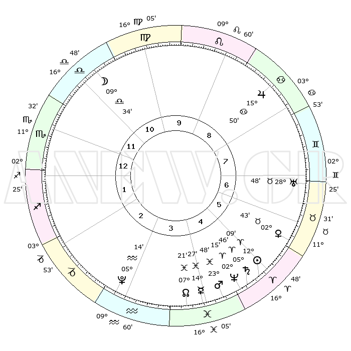 | | ΘΕΣΕΙΣ ΠΛΑΝΗΤΩΝ ΑΣΤΡΟΛΟΓΙΚΟΥ ΧΑΡΤΗ ΤΗΣ ΣΤΙΓΜΗΣ ΑΥΤΗΣ | | | | Πλανήτης | Ζώδιο | Μοίρες | Δεκαήμ. | Σε οίκο | Απόκλιση | | Ακμές των οίκων | | Ηλιος | Κριός | 12°05' | Δεύτερο | 5 | 04 N 46 | | 1ος | 13°50' | Σκορπιός | | Σελήνη | Ζυγός | 08°45' | Πρώτο | 11 | 05 S 52 | | 2ος | 13°13' | Τοξότης | | Ερμής | Ιχθείς | 14°24' | Δεύτερο | 4 | 07 S 27 | | 3ος | 16°34' | Αιγόκερως | | Αφροδίτη | Ταύρος | 02°39' | Πρώτο | 6 | 12 N 00 | | 4ος | 21°45' | Υδροχόος | | Αρης | Ιχθείς | 23°45' | Τρίτο | 4 | 03 S 26 | | 5ος | 24°14' | Ιχθείς | | Δίας | Καρκίνος | 15°50' | Δεύτερο | 8 | 22 N 52 | | 6ος | 21°25' | Κριός | | Κρόνος | Κριός | 05°46' | Πρώτο | 5 | 00 N 20 | | 7ος | 13°50' | Ταύρος | | Ουρανός | Ταύρος | 28°48' | Τρίτο | 7 | 19 N 43 | | 8ος | 13°13' | Δίδυμοι | | Ποσειδώνας | Κριός | 02°14' | Πρώτο | 5 | 00 S 19 | | 9ος | 16°34' | Καρκίνος | | Πλούτωνας | Υδροχόος | 05°14' | Πρώτο | 3 | 22 S 47 | | 10ος | 21°45' | Λέων | | Β. Δεσμός | Ιχθείς | 07°22' | Πρώτο | 4 | 08 S 48 | | 11ος | 24°14' | Παρθένος | | Ωροσκόπος | Σκορπιός | 13°50' | Δεύτερο | | | 12ος | 21°25' | Ζυγός | | Μεσουράνημα | Λέων | 21°45' | Τρίτο | | | |