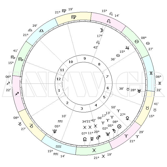 | | ΘΕΣΕΙΣ ΠΛΑΝΗΤΩΝ ΑΣΤΡΟΛΟΓΙΚΟΥ ΧΑΡΤΗ ΤΗΣ ΣΤΙΓΜΗΣ ΑΥΤΗΣ | | | | Πλανήτης | Ζώδιο | Μοίρες | Δεκαήμ. | Σε οίκο | Απόκλιση | | Ακμές των οίκων | | Ηλιος | Κριός | 08°09' | Πρώτο | 5 | 03 N 14 | | 1ος | 16°30' | Σκορπιός | | Σελήνη | Λέων | 16°47' | Δεύτερο | 9 | 17 N 40 | | 2ος | 16°07' | Τοξότης | | Ερμής | Ιχθείς | 11°19' | Δεύτερο | 4 | 08 S 02 | | 3ος | 19°48' | Αιγόκερως | | Αφροδίτη | Κριός | 27°45' | Τρίτο | 6 | 10 N 08 | | 4ος | 25°11' | Υδροχόος | | Αρης | Ιχθείς | 20°39' | Τρίτο | 4 | 04 S 41 | | 5ος | 27°30' | Ιχθείς | | Δίας | Καρκίνος | 15°35' | Δεύτερο | 8 | 22 N 53 | | 6ος | 24°21' | Κριός | | Κρόνος | Κριός | 05°16' | Πρώτο | 5 | 00 N 08 | | 7ος | 16°30' | Ταύρος | | Ουρανός | Ταύρος | 28°38' | Τρίτο | 7 | 19 N 41 | | 8ος | 16°07' | Δίδυμοι | | Ποσειδώνας | Κριός | 02°05' | Πρώτο | 5 | 00 S 22 | | 9ος | 19°48' | Καρκίνος | | Πλούτωνας | Υδροχόος | 05°10' | Πρώτο | 3 | 22 S 48 | | 10ος | 25°11' | Λέων | | Β. Δεσμός | Ιχθείς | 07°34' | Πρώτο | 4 | 08 S 44 | | 11ος | 27°30' | Παρθένος | | Ωροσκόπος | Σκορπιός | 16°30' | Δεύτερο | | | 12ος | 24°21' | Ζυγός | | Μεσουράνημα | Λέων | 25°11' | Τρίτο | | | |