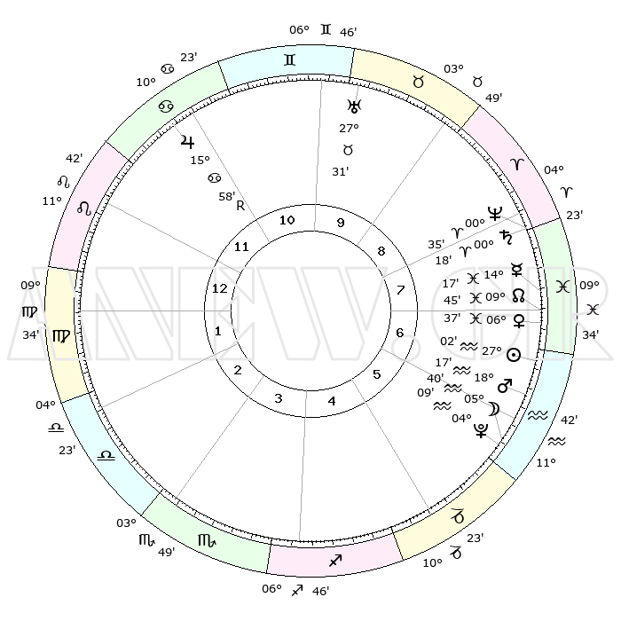 | | ΘΕΣΕΙΣ ΠΛΑΝΗΤΩΝ ΑΣΤΡΟΛΟΓΙΚΟΥ ΧΑΡΤΗ ΤΗΣ ΣΤΙΓΜΗΣ ΑΥΤΗΣ | | | | Πλανήτης | Ζώδιο | Μοίρες | Δεκαήμ. | Σε οίκο | Απόκλιση | | Ακμές των οίκων | | Ηλιος | Υδροχόος | 26°58' | Τρίτο | 7 | 12 S 31 | | 1ος | 22°10' | Λέων | | Σελήνη | Υδροχόος | 04°54' | Πρώτο | 6 | 21 S 54 | | 2ος | 15°12' | Παρθένος | | Ερμής | Ιχθείς | 14°12' | Δεύτερο | 7 | 06 S 02 | | 3ος | 13°05' | Ζυγός | | Αφροδίτη | Ιχθείς | 06°33' | Πρώτο | 7 | 10 S 28 | | 4ος | 15°50' | Σκορπιός | | Αρης | Υδροχόος | 18°14' | Δεύτερο | 6 | 16 S 23 | | 5ος | 20°35' | Τοξότης | | Δίας | Καρκίνος | 15°59'R | Δεύτερο | 11 | 22 N 48 | | 6ος | 23°15' | Αιγόκερως | | Κρόνος | Κριός | 00°18' | Πρώτο | 8 | 01 S 51 | | 7ος | 22°10' | Υδροχόος | | Ουρανός | Ταύρος | 27°31' | Τρίτο | 10 | 19 N 25 | | 8ος | 15°12' | Ιχθείς | | Ποσειδώνας | Κριός | 00°35' | Πρώτο | 8 | 00 S 58 | | 9ος | 13°05' | Κριός | | Πλούτωνας | Υδροχόος | 04°09' | Πρώτο | 6 | 22 S 56 | | 10ος | 15°50' | Ταύρος | | Β. Δεσμός | Ιχθείς | 09°45' | Πρώτο | 7 | 07 S 55 | | 11ος | 20°35' | Δίδυμοι | | Ωροσκόπος | Λέων | 22°10' | Τρίτο | | | 12ος | 23°15' | Καρκίνος | | Μεσουράνημα | Ταύρος | 15°50' | Δεύτερο | | | |