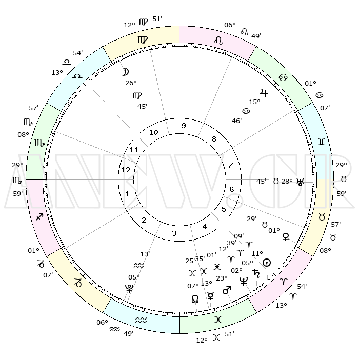 | | ΘΕΣΕΙΣ ΠΛΑΝΗΤΩΝ ΑΣΤΡΟΛΟΓΙΚΟΥ ΧΑΡΤΗ ΤΗΣ ΣΤΙΓΜΗΣ ΑΥΤΗΣ | | | | Πλανήτης | Ζώδιο | Μοίρες | Δεκαήμ. | Σε οίκο | Απόκλιση | | Ακμές των οίκων | | Ηλιος | Κριός | 11°05' | Δεύτερο | 5 | 04 N 23 | | 1ος | 11°27' | Σκορπιός | | Σελήνη | Παρθένος | 25°55' | Τρίτο | 11 | 00 N 12 | | 2ος | 10°38' | Τοξότης | | Ερμής | Ιχθείς | 13°32' | Δεύτερο | 4 | 07 S 39 | | 3ος | 13°41' | Αιγόκερως | | Αφροδίτη | Ταύρος | 01°24' | Πρώτο | 6 | 11 N 32 | | 4ος | 18°42' | Υδροχόος | | Αρης | Ιχθείς | 22°58' | Τρίτο | 5 | 03 S 45 | | 5ος | 21°19' | Ιχθείς | | Δίας | Καρκίνος | 15°46' | Δεύτερο | 9 | 22 N 52 | | 6ος | 18°47' | Κριός | | Κρόνος | Κριός | 05°38' | Πρώτο | 5 | 00 N 17 | | 7ος | 11°27' | Ταύρος | | Ουρανός | Ταύρος | 28°45' | Τρίτο | 7 | 19 N 43 | | 8ος | 10°38' | Δίδυμοι | | Ποσειδώνας | Κριός | 02°12' | Πρώτο | 5 | 00 S 20 | | 9ος | 13°41' | Καρκίνος | | Πλούτωνας | Υδροχόος | 05°13' | Πρώτο | 3 | 22 S 47 | | 10ος | 18°42' | Λέων | | Β. Δεσμός | Ιχθείς | 07°25' | Πρώτο | 4 | 08 S 47 | | 11ος | 21°19' | Παρθένος | | Ωροσκόπος | Σκορπιός | 11°27' | Δεύτερο | | | 12ος | 18°47' | Ζυγός | | Μεσουράνημα | Λέων | 18°42' | Δεύτερο | | | |