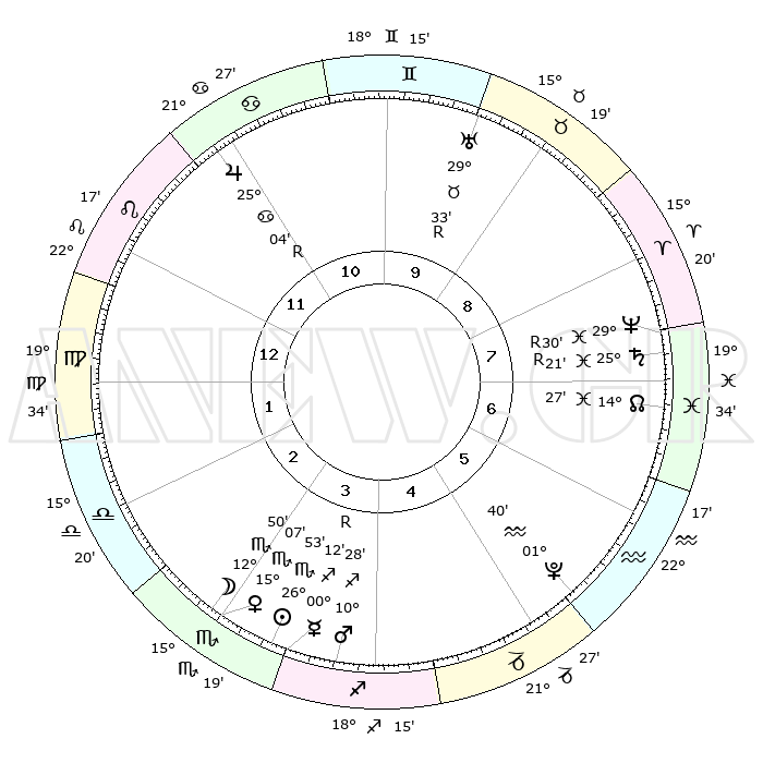 | | ΘΕΣΕΙΣ ΠΛΑΝΗΤΩΝ ΑΣΤΡΟΛΟΓΙΚΟΥ ΧΑΡΤΗ ΤΗΣ ΣΤΙΓΜΗΣ ΑΥΤΗΣ | | | | Πλανήτης | Ζώδιο | Μοίρες | Δεκαήμ. | Σε οίκο | Απόκλιση | | Ακμές των οίκων | | Ηλιος | Σκορπιός | 26°50' | Τρίτο | 3 | 19 S 27 | | 1ος | 03°17' | Παρθένος | | Σελήνη | Σκορπιός | 12°11' | Δεύτερο | 3 | 19 S 28 | | 2ος | 27°29' | Παρθένος | | Ερμής | Τοξότης | 00°16'R | Πρώτο | 4 | 20 S 10 | | 3ος | 26°26' | Ζυγός | | Αφροδίτη | Σκορπιός | 15°03' | Δεύτερο | 3 | 15 S 18 | | 4ος | 29°23' | Σκορπιός | | Αρης | Τοξότης | 10°25' | Δεύτερο | 4 | 22 S 33 | | 5ος | 03°21' | Αιγόκερως | | Δίας | Καρκίνος | 25°04'R | Τρίτο | 11 | 21 N 14 | | 6ος | 05°04' | Υδροχόος | | Κρόνος | Ιχθείς | 25°22'R | Τρίτο | 7 | 04 S 03 | | 7ος | 03°17' | Ιχθείς | | Ουρανός | Ταύρος | 29°33'R | Τρίτο | 10 | 19 N 51 | | 8ος | 27°29' | Ιχθείς | | Ποσειδώνας | Ιχθείς | 29°30'R | Τρίτο | 8 | 01 S 27 | | 9ος | 26°26' | Κριός | | Πλούτωνας | Υδροχόος | 01°40' | Πρώτο | 5 | 23 S 27 | | 10ος | 29°23' | Ταύρος | | Β. Δεσμός | Ιχθείς | 14°27' | Δεύτερο | 7 | 06 S 07 | | 11ος | 03°21' | Καρκίνος | | Ωροσκόπος | Παρθένος | 03°17' | Πρώτο | | | 12ος | 05°04' | Λέων | | Μεσουράνημα | Ταύρος | 29°23' | Τρίτο | | | |
