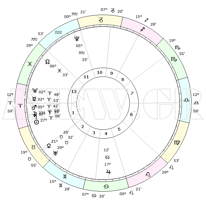 | | ΘΕΣΕΙΣ ΠΛΑΝΗΤΩΝ ΑΣΤΡΟΛΟΓΙΚΟΥ ΧΑΡΤΗ ΤΗΣ ΣΤΙΓΜΗΣ ΑΥΤΗΣ | | | | Πλανήτης | Ζώδιο | Μοίρες | Δεκαήμ. | Σε οίκο | Απόκλιση | | Ακμές των οίκων | | Ηλιος | Κριός | 27°06' | Τρίτο | 1 | 10 N 26 | | 1ος | 14°05' | Ιχθείς | | Σελήνη | Κριός | 21°31' | Τρίτο | 1 | 11 N 40 | | 2ος | 27°43' | Κριός | | Ερμής | Κριός | 02°48' | Πρώτο | 1 | 01 S 18 | | 3ος | 27°46' | Ταύρος | | Αφροδίτη | Ταύρος | 21°23' | Τρίτο | 2 | 18 N 22 | | 4ος | 20°59' | Δίδυμοι | | Αρης | Κριός | 05°39' | Πρώτο | 1 | 01 N 21 | | 5ος | 12°47' | Καρκίνος | | Δίας | Καρκίνος | 17°11' | Δεύτερο | 5 | 22 N 42 | | 6ος | 07°57' | Λέων | | Κρόνος | Κριός | 07°38' | Πρώτο | 1 | 01 N 03 | | 7ος | 14°05' | Παρθένος | | Ουρανός | Ταύρος | 29°32' | Τρίτο | 3 | 19 N 53 | | 8ος | 27°43' | Ζυγός | | Ποσειδώνας | Κριός | 02°48' | Πρώτο | 1 | 00 S 06 | | 9ος | 27°46' | Σκορπιός | | Πλούτωνας | Υδροχόος | 05°25' | Πρώτο | 11 | 22 S 47 | | 10ος | 20°59' | Τοξότης | | Β. Δεσμός | Ιχθείς | 06°33' | Πρώτο | 12 | 09 S 06 | | 11ος | 12°47' | Αιγόκερως | | Ωροσκόπος | Ιχθείς | 14°05' | Δεύτερο | | | 12ος | 07°57' | Υδροχόος | | Μεσουράνημα | Τοξότης | 20°59' | Τρίτο | | | |