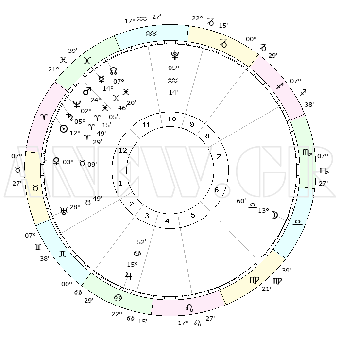 | | ΘΕΣΕΙΣ ΠΛΑΝΗΤΩΝ ΑΣΤΡΟΛΟΓΙΚΟΥ ΧΑΡΤΗ ΤΗΣ ΣΤΙΓΜΗΣ ΑΥΤΗΣ | | | | Πλανήτης | Ζώδιο | Μοίρες | Δεκαήμ. | Σε οίκο | Απόκλιση | | Ακμές των οίκων | | Ηλιος | Κριός | 12°26' | Δεύτερο | 1 | 04 N 55 | | 1ος | 10°10' | Κριός | | Σελήνη | Ζυγός | 13°22' | Δεύτερο | 7 | 08 S 00 | | 2ος | 17°51' | Ταύρος | | Ερμής | Ιχθείς | 14°44' | Δεύτερο | 12 | 07 S 23 | | 3ος | 13°47' | Δίδυμοι | | Αφροδίτη | Ταύρος | 03°06' | Πρώτο | 1 | 12 N 10 | | 4ος | 05°43' | Καρκίνος | | Αρης | Ιχθείς | 24°03' | Τρίτο | 12 | 03 S 19 | | 5ος | 28°34' | Καρκίνος | | Δίας | Καρκίνος | 15°52' | Δεύτερο | 4 | 22 N 52 | | 6ος | 27°36' | Λέων | | Κρόνος | Κριός | 05°48' | Πρώτο | 12 | 00 N 21 | | 7ος | 10°10' | Ζυγός | | Ουρανός | Ταύρος | 28°49' | Τρίτο | 2 | 19 N 43 | | 8ος | 17°51' | Σκορπιός | | Ποσειδώνας | Κριός | 02°15' | Πρώτο | 12 | 00 S 18 | | 9ος | 13°47' | Τοξότης | | Πλούτωνας | Υδροχόος | 05°14' | Πρώτο | 11 | 22 S 47 | | 10ος | 05°44' | Αιγόκερως | | Β. Δεσμός | Ιχθείς | 07°20' | Πρώτο | 12 | 08 S 49 | | 11ος | 28°34' | Αιγόκερως | | Ωροσκόπος | Κριός | 10°10' | Δεύτερο | | | 12ος | 27°36' | Υδροχόος | | Μεσουράνημα | Αιγόκερως | 05°44' | Πρώτο | | | |
