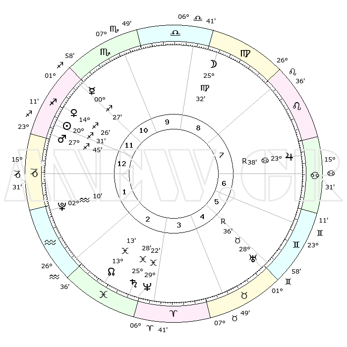 | | ΘΕΣΕΙΣ ΠΛΑΝΗΤΩΝ ΑΣΤΡΟΛΟΓΙΚΟΥ ΧΑΡΤΗ ΤΗΣ ΣΤΙΓΜΗΣ ΑΥΤΗΣ | | | | Πλανήτης | Ζώδιο | Μοίρες | Δεκαήμ. | Σε οίκο | Απόκλιση | | Ακμές των οίκων | | Ηλιος | Τοξότης | 20°27' | Τρίτο | 12 | 23 S 05 | | 1ος | 20°47' | Τοξότης | | Σελήνη | Παρθένος | 24°38' | Τρίτο | 9 | 01 N 12 | | 2ος | 25°42' | Αιγόκερως | | Ερμής | Τοξότης | 00°22' | Πρώτο | 12 | 18 S 23 | | 3ος | 04°45' | Ιχθείς | | Αφροδίτη | Τοξότης | 14°20' | Δεύτερο | 12 | 22 S 15 | | 4ος | 09°57' | Κριός | | Αρης | Τοξότης | 27°41' | Τρίτο | 1 | 24 S 10 | | 5ος | 07°47' | Ταύρος | | Δίας | Καρκίνος | 23°38'R | Τρίτο | 7 | 21 N 33 | | 6ος | 00°20' | Δίδυμοι | | Κρόνος | Ιχθείς | 25°27' | Τρίτο | 3 | 03 S 57 | | 7ος | 20°47' | Δίδυμοι | | Ουρανός | Ταύρος | 28°36'R | Τρίτο | 5 | 19 N 39 | | 8ος | 25°42' | Καρκίνος | | Ποσειδώνας | Ιχθείς | 29°22' | Τρίτο | 3 | 01 S 29 | | 9ος | 04°45' | Παρθένος | | Πλούτωνας | Υδροχόος | 02°10' | Πρώτο | 2 | 23 S 20 | | 10ος | 09°57' | Ζυγός | | Β. Δεσμός | Ιχθείς | 13°13' | Δεύτερο | 3 | 06 S 36 | | 11ος | 07°47' | Σκορπιός | | Ωροσκόπος | Τοξότης | 20°47' | Τρίτο | | | 12ος | 00°20' | Τοξότης | | Μεσουράνημα | Ζυγός | 09°57' | Πρώτο | | | |