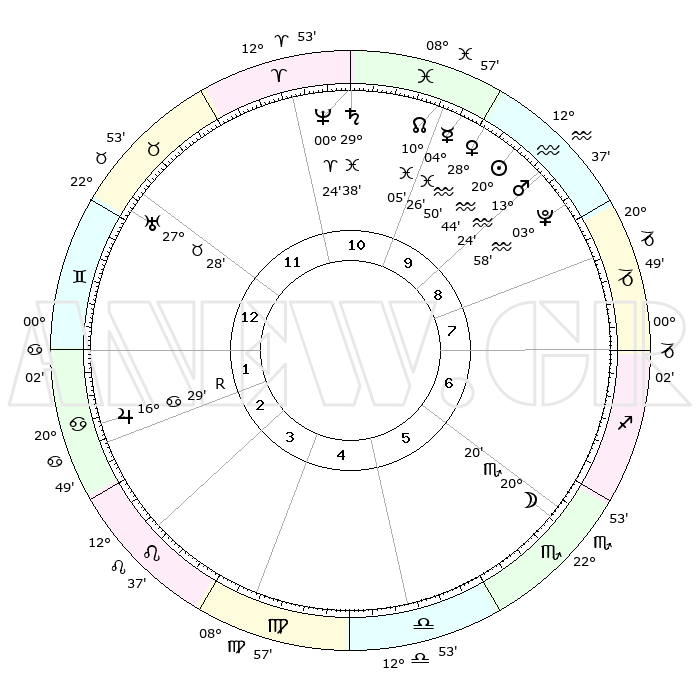 | | ΘΕΣΕΙΣ ΠΛΑΝΗΤΩΝ ΑΣΤΡΟΛΟΓΙΚΟΥ ΧΑΡΤΗ ΤΗΣ ΣΤΙΓΜΗΣ ΑΥΤΗΣ | | | | Πλανήτης | Ζώδιο | Μοίρες | Δεκαήμ. | Σε οίκο | Απόκλιση | | Ακμές των οίκων | | Ηλιος | Υδροχόος | 20°40' | Τρίτο | 10 | 14 S 36 | | 1ος | 05°49' | Δίδυμοι | | Σελήνη | Σκορπιός | 19°32' | Δεύτερο | 6 | 22 S 22 | | 2ος | 29°31' | Δίδυμοι | | Ερμής | Ιχθείς | 04°19' | Πρώτο | 10 | 10 S 51 | | 3ος | 20°47' | Καρκίνος | | Αφροδίτη | Υδροχόος | 28°45' | Τρίτο | 10 | 13 S 16 | | 4ος | 14°01' | Λέων | | Αρης | Υδροχόος | 13°21' | Δεύτερο | 9 | 17 S 50 | | 5ος | 13°31' | Παρθένος | | Δίας | Καρκίνος | 16°30'R | Δεύτερο | 2 | 22 N 44 | | 6ος | 22°47' | Ζυγός | | Κρόνος | Ιχθείς | 29°37' | Τρίτο | 11 | 02 S 08 | | 7ος | 05°49' | Τοξότης | | Ουρανός | Ταύρος | 27°28' | Τρίτο | 12 | 19 N 25 | | 8ος | 29°31' | Τοξότης | | Ποσειδώνας | Κριός | 00°23' | Πρώτο | 11 | 01 S 03 | | 9ος | 20°47' | Αιγόκερως | | Πλούτωνας | Υδροχόος | 03°58' | Πρώτο | 9 | 22 S 58 | | 10ος | 14°01' | Υδροχόος | | Β. Δεσμός | Ιχθείς | 10°05' | Δεύτερο | 10 | 07 S 47 | | 11ος | 13°31' | Ιχθείς | | Ωροσκόπος | Δίδυμοι | 05°49' | Πρώτο | | | 12ος | 22°47' | Κριός | | Μεσουράνημα | Υδροχόος | 14°01' | Δεύτερο | | | |
