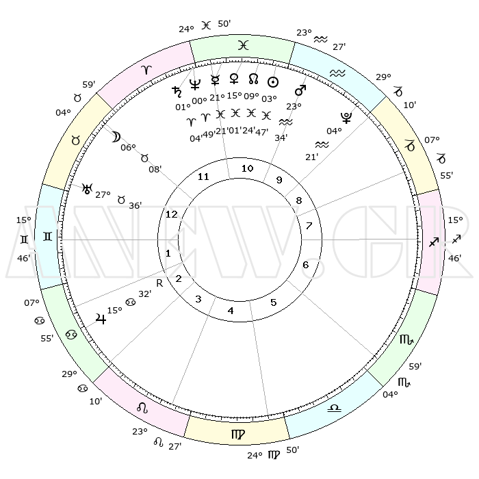 | | ΘΕΣΕΙΣ ΠΛΑΝΗΤΩΝ ΑΣΤΡΟΛΟΓΙΚΟΥ ΧΑΡΤΗ ΤΗΣ ΣΤΙΓΜΗΣ ΑΥΤΗΣ | | | | Πλανήτης | Ζώδιο | Μοίρες | Δεκαήμ. | Σε οίκο | Απόκλιση | | Ακμές των οίκων | | Ηλιος | Ιχθείς | 03°43' | Πρώτο | 11 | 10 S 09 | | 1ος | 14°16' | Ταύρος | | Σελήνη | Ταύρος | 05°05' | Πρώτο | 12 | 17 N 21 | | 2ος | 12°41' | Δίδυμοι | | Ερμής | Ιχθείς | 21°18' | Τρίτο | 11 | 01 S 45 | | 3ος | 04°59' | Καρκίνος | | Αφροδίτη | Ιχθείς | 14°55' | Δεύτερο | 11 | 07 S 16 | | 4ος | 26°55' | Καρκίνος | | Αρης | Υδροχόος | 23°30' | Τρίτο | 11 | 14 S 43 | | 5ος | 22°58' | Λέων | | Δίας | Καρκίνος | 15°33'R | Δεύτερο | 3 | 22 N 52 | | 6ος | 28°33' | Παρθένος | | Κρόνος | Κριός | 01°03' | Πρώτο | 12 | 01 S 33 | | 7ος | 14°16' | Σκορπιός | | Ουρανός | Ταύρος | 27°36' | Τρίτο | 1 | 19 N 27 | | 8ος | 12°41' | Τοξότης | | Ποσειδώνας | Κριός | 00°49' | Πρώτο | 12 | 00 S 53 | | 9ος | 04°59' | Αιγόκερως | | Πλούτωνας | Υδροχόος | 04°21' | Πρώτο | 10 | 22 S 54 | | 10ος | 26°55' | Αιγόκερως | | Β. Δεσμός | Ιχθείς | 09°24' | Πρώτο | 11 | 08 S 03 | | 11ος | 22°58' | Υδροχόος | | Ωροσκόπος | Ταύρος | 14°16' | Δεύτερο | | | 12ος | 28°33' | Ιχθείς | | Μεσουράνημα | Αιγόκερως | 26°55' | Τρίτο | | | |