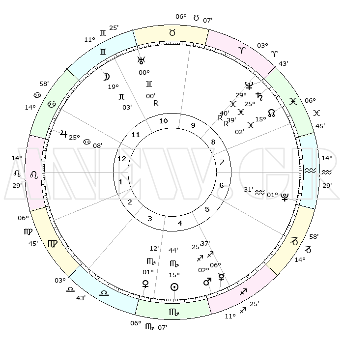 | | ΘΕΣΕΙΣ ΠΛΑΝΗΤΩΝ ΑΣΤΡΟΛΟΓΙΚΟΥ ΧΑΡΤΗ ΤΗΣ ΣΤΙΓΜΗΣ ΑΥΤΗΣ | | | | Πλανήτης | Ζώδιο | Μοίρες | Δεκαήμ. | Σε οίκο | Απόκλιση | | Ακμές των οίκων | | Ηλιος | Σκορπιός | 15°32' | Δεύτερο | 6 | 16 S 29 | | 1ος | 09°47' | Δίδυμοι | | Σελήνη | Δίδυμοι | 15°59' | Δεύτερο | 1 | 27 N 44 | | 2ος | 02°49' | Καρκίνος | | Ερμής | Τοξότης | 06°33' | Πρώτο | 6 | 23 S 59 | | 3ος | 24°02' | Καρκίνος | | Αφροδίτη | Σκορπιός | 00°57' | Πρώτο | 6 | 10 S 31 | | 4ος | 17°39' | Λέων | | Αρης | Τοξότης | 02°16' | Πρώτο | 6 | 21 S 03 | | 5ος | 17°53' | Παρθένος | | Δίας | Καρκίνος | 25°08' | Τρίτο | 3 | 21 N 12 | | 6ος | 27°36' | Ζυγός | | Κρόνος | Ιχθείς | 25°39'R | Τρίτο | 11 | 03 S 58 | | 7ος | 09°47' | Τοξότης | | Ουρανός | Δίδυμοι | 00°01'R | Πρώτο | 12 | 19 N 57 | | 8ος | 02°49' | Αιγόκερως | | Ποσειδώνας | Ιχθείς | 29°40'R | Τρίτο | 11 | 01 S 23 | | 9ος | 24°02' | Αιγόκερως | | Πλούτωνας | Υδροχόος | 01°31' | Πρώτο | 9 | 23 S 30 | | 10ος | 17°39' | Υδροχόος | | Β. Δεσμός | Ιχθείς | 15°03' | Δεύτερο | 10 | 05 S 53 | | 11ος | 17°53' | Ιχθείς | | Ωροσκόπος | Δίδυμοι | 09°47' | Πρώτο | | | 12ος | 27°36' | Κριός | | Μεσουράνημα | Υδροχόος | 17°39' | Δεύτερο | | | |