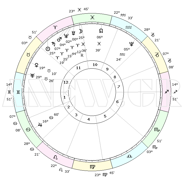| | ΘΕΣΕΙΣ ΠΛΑΝΗΤΩΝ ΑΣΤΡΟΛΟΓΙΚΟΥ ΧΑΡΤΗ ΤΗΣ ΣΤΙΓΜΗΣ ΑΥΤΗΣ | | | | Πλανήτης | Ζώδιο | Μοίρες | Δεκαήμ. | Σε οίκο | Απόκλιση | | Ακμές των οίκων | | Ηλιος | Κριός | 25°15' | Τρίτο | 12 | 09 N 46 | | 1ος | 17°46' | Ταύρος | | Σελήνη | Ιχθείς | 24°42' | Τρίτο | 11 | 00 S 45 | | 2ος | 15°19' | Δίδυμοι | | Ερμής | Κριός | 00°06'R | Πρώτο | 11 | 02 S 20 | | 3ος | 07°22' | Καρκίνος | | Αφροδίτη | Ταύρος | 19°05' | Δεύτερο | 1 | 17 N 40 | | 4ος | 29°26' | Καρκίνος | | Αρης | Κριός | 04°12' | Πρώτο | 12 | 00 N 46 | | 5ος | 25°58' | Λέων | | Δίας | Καρκίνος | 16°59' | Δεύτερο | 3 | 22 N 44 | | 6ος | 02°13' | Ζυγός | | Κρόνος | Κριός | 07°25' | Πρώτο | 12 | 00 N 58 | | 7ος | 17°46' | Σκορπιός | | Ουρανός | Ταύρος | 29°26' | Τρίτο | 1 | 19 N 52 | | 8ος | 15°19' | Τοξότης | | Ποσειδώνας | Κριός | 02°44' | Πρώτο | 12 | 00 S 07 | | 9ος | 07°22' | Αιγόκερως | | Πλούτωνας | Υδροχόος | 05°24' | Πρώτο | 10 | 22 S 47 | | 10ος | 29°26' | Αιγόκερως | | Β. Δεσμός | Ιχθείς | 06°39' | Πρώτο | 11 | 09 S 04 | | 11ος | 25°58' | Υδροχόος | | Ωροσκόπος | Ταύρος | 17°46' | Δεύτερο | | | 12ος | 02°13' | Κριός | | Μεσουράνημα | Αιγόκερως | 29°26' | Τρίτο | | | |