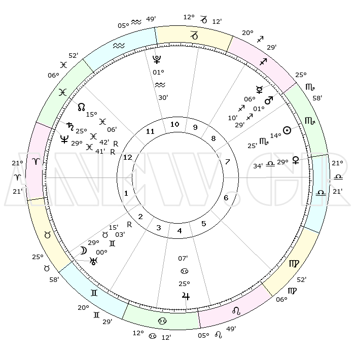 | | ΘΕΣΕΙΣ ΠΛΑΝΗΤΩΝ ΑΣΤΡΟΛΟΓΙΚΟΥ ΧΑΡΤΗ ΤΗΣ ΣΤΙΓΜΗΣ ΑΥΤΗΣ | | | | Πλανήτης | Ζώδιο | Μοίρες | Δεκαήμ. | Σε οίκο | Απόκλιση | | Ακμές των οίκων | | Ηλιος | Σκορπιός | 14°20' | Δεύτερο | 8 | 16 S 08 | | 1ος | 28°39' | Υδροχόος | | Σελήνη | Ταύρος | 27°51' | Τρίτο | 3 | 24 N 21 | | 2ος | 14°11' | Κριός | | Ερμής | Τοξότης | 06°08' | Πρώτο | 9 | 24 S 00 | | 3ος | 17°09' | Ταύρος | | Αφροδίτη | Ζυγός | 29°27' | Τρίτο | 8 | 09 S 59 | | 4ος | 11°42' | Δίδυμοι | | Αρης | Τοξότης | 01°25' | Πρώτο | 9 | 20 S 52 | | 5ος | 03°23' | Καρκίνος | | Δίας | Καρκίνος | 25°06' | Τρίτο | 5 | 21 N 12 | | 6ος | 26°48' | Καρκίνος | | Κρόνος | Ιχθείς | 25°42'R | Τρίτο | 1 | 03 S 58 | | 7ος | 28°39' | Λέων | | Ουρανός | Δίδυμοι | 00°03'R | Πρώτο | 3 | 19 N 57 | | 8ος | 14°11' | Ζυγός | | Ποσειδώνας | Ιχθείς | 29°41'R | Τρίτο | 1 | 01 S 23 | | 9ος | 17°09' | Σκορπιός | | Πλούτωνας | Υδροχόος | 01°30' | Πρώτο | 12 | 23 S 30 | | 10ος | 11°42' | Τοξότης | | Β. Δεσμός | Ιχθείς | 15°06' | Δεύτερο | 1 | 05 S 52 | | 11ος | 03°23' | Αιγόκερως | | Ωροσκόπος | Υδροχόος | 28°39' | Τρίτο | | | 12ος | 26°48' | Αιγόκερως | | Μεσουράνημα | Τοξότης | 11°42' | Δεύτερο | | | |