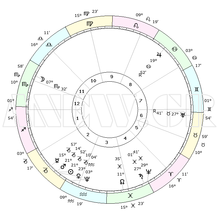 | | ΘΕΣΕΙΣ ΠΛΑΝΗΤΩΝ ΑΣΤΡΟΛΟΓΙΚΟΥ ΧΑΡΤΗ ΤΗΣ ΣΤΙΓΜΗΣ ΑΥΤΗΣ | | | | Πλανήτης | Ζώδιο | Μοίρες | Δεκαήμ. | Σε οίκο | Απόκλιση | | Ακμές των οίκων | | Ηλιος | Αιγόκερως | 21°47' | Τρίτο | 3 | 21 S 40 | | 1ος | 08°30' | Σκορπιός | | Σελήνη | Σκορπιός | 06°35' | Πρώτο | 12 | 17 S 44 | | 2ος | 07°28' | Τοξότης | | Ερμής | Αιγόκερως | 15°50' | Δεύτερο | 3 | 24 S 04 | | 3ος | 10°12' | Αιγόκερως | | Αφροδίτη | Αιγόκερως | 23°04' | Τρίτο | 3 | 22 S 20 | | 4ος | 15°00' | Υδροχόος | | Αρης | Αιγόκερως | 21°10' | Τρίτο | 3 | 22 S 43 | | 5ος | 17°44' | Ιχθείς | | Δίας | Καρκίνος | 19°53'R | Δεύτερο | 9 | 22 N 13 | | 6ος | 15°33' | Κριός | | Κρόνος | Ιχθείς | 27°01' | Τρίτο | 5 | 03 S 14 | | 7ος | 08°30' | Ταύρος | | Ουρανός | Ταύρος | 27°41'R | Τρίτο | 7 | 19 N 27 | | 8ος | 07°28' | Δίδυμοι | | Ποσειδώνας | Ιχθείς | 29°41' | Τρίτο | 5 | 01 S 21 | | 9ος | 10°12' | Καρκίνος | | Πλούτωνας | Υδροχόος | 03°04' | Πρώτο | 3 | 23 S 09 | | 10ος | 15°00' | Λέων | | Β. Δεσμός | Ιχθείς | 11°35' | Δεύτερο | 4 | 07 S 13 | | 11ος | 17°44' | Παρθένος | | Ωροσκόπος | Σκορπιός | 08°30' | Πρώτο | | | 12ος | 15°33' | Ζυγός | | Μεσουράνημα | Λέων | 15°00' | Δεύτερο | | | |
