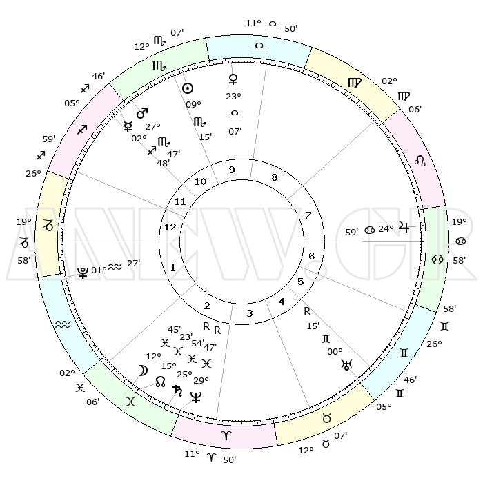 | | ΘΕΣΕΙΣ ΠΛΑΝΗΤΩΝ ΑΣΤΡΟΛΟΓΙΚΟΥ ΧΑΡΤΗ ΤΗΣ ΣΤΙΓΜΗΣ ΑΥΤΗΣ | | | | Πλανήτης | Ζώδιο | Μοίρες | Δεκαήμ. | Σε οίκο | Απόκλιση | | Ακμές των οίκων | | Ηλιος | Σκορπιός | 09°08' | Πρώτο | 11 | 14 S 32 | | 1ος | 08°52' | Τοξότης | | Σελήνη | Ιχθείς | 11°03' | Δεύτερο | 3 | 07 S 55 | | 2ος | 11°23' | Αιγόκερως | | Ερμής | Τοξότης | 02°42' | Πρώτο | 12 | 23 S 32 | | 3ος | 18°35' | Υδροχόος | | Αφροδίτη | Ζυγός | 22°57' | Τρίτο | 10 | 07 S 33 | | 4ος | 24°36' | Ιχθείς | | Αρης | Σκορπιός | 27°42' | Τρίτο | 12 | 20 S 02 | | 5ος | 24°24' | Κριός | | Δίας | Καρκίνος | 24°58' | Τρίτο | 8 | 21 N 13 | | 6ος | 18°17' | Ταύρος | | Κρόνος | Ιχθείς | 25°55'R | Τρίτο | 4 | 03 S 53 | | 7ος | 08°52' | Δίδυμοι | | Ουρανός | Δίδυμοι | 00°16'R | Πρώτο | 6 | 20 N 00 | | 8ος | 11°23' | Καρκίνος | | Ποσειδώνας | Ιχθείς | 29°47'R | Τρίτο | 4 | 01 S 21 | | 9ος | 18°35' | Λέων | | Πλούτωνας | Υδροχόος | 01°27' | Πρώτο | 2 | 23 S 31 | | 10ος | 24°36' | Παρθένος | | Β. Δεσμός | Ιχθείς | 15°23' | Δεύτερο | 3 | 05 S 46 | | 11ος | 24°24' | Ζυγός | | Ωροσκόπος | Τοξότης | 08°52' | Πρώτο | | | 12ος | 18°17' | Σκορπιός | | Μεσουράνημα | Παρθένος | 24°36' | Τρίτο | | | |