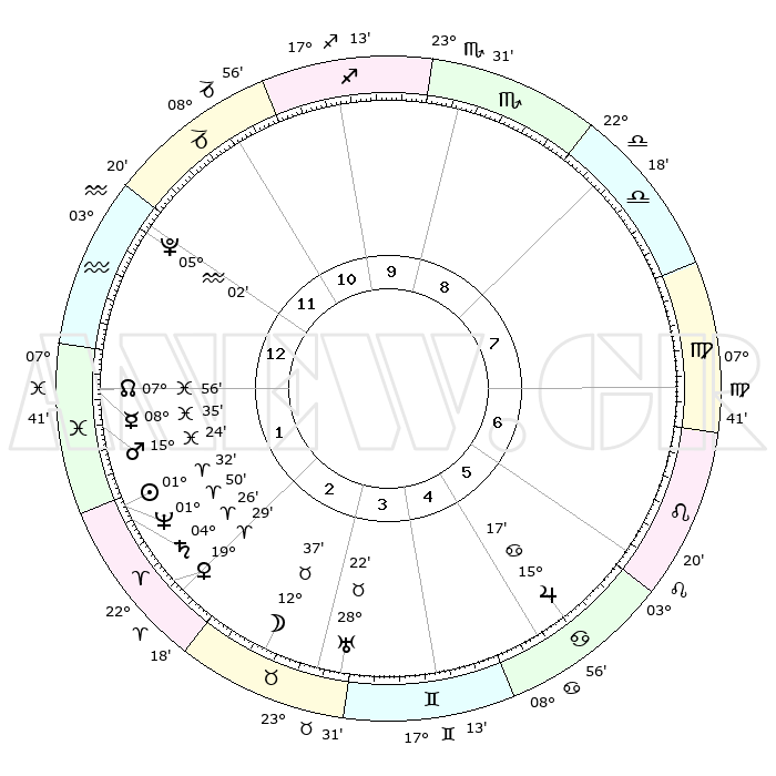 | | ΘΕΣΕΙΣ ΠΛΑΝΗΤΩΝ ΑΣΤΡΟΛΟΓΙΚΟΥ ΧΑΡΤΗ ΤΗΣ ΣΤΙΓΜΗΣ ΑΥΤΗΣ | | | | Πλανήτης | Ζώδιο | Μοίρες | Δεκαήμ. | Σε οίκο | Απόκλιση | | Ακμές των οίκων | | Ηλιος | Κριός | 01°28' | Πρώτο | 2 | 00 N 35 | | 1ος | 06°02' | Υδροχόος | | Σελήνη | Ταύρος | 11°43' | Δεύτερο | 3 | 19 N 46 | | 2ος | 20°59' | Ιχθείς | | Ερμής | Ιχθείς | 08°34' | Πρώτο | 1 | 07 S 43 | | 3ος | 28°25' | Κριός | | Αφροδίτη | Κριός | 19°25' | Δεύτερο | 2 | 06 N 50 | | 4ος | 25°53' | Ταύρος | | Αρης | Ιχθείς | 15°21' | Δεύτερο | 1 | 06 S 46 | | 5ος | 18°15' | Δίδυμοι | | Δίας | Καρκίνος | 15°17' | Δεύτερο | 6 | 22 N 55 | | 6ος | 09°56' | Καρκίνος | | Κρόνος | Κριός | 04°26' | Πρώτο | 2 | 00 S 12 | | 7ος | 06°02' | Λέων | | Ουρανός | Ταύρος | 28°22' | Τρίτο | 4 | 19 N 37 | | 8ος | 20°59' | Παρθένος | | Ποσειδώνας | Κριός | 01°50' | Πρώτο | 2 | 00 S 28 | | 9ος | 28°25' | Ζυγός | | Πλούτωνας | Υδροχόος | 05°02' | Πρώτο | 12 | 22 S 48 | | 10ος | 25°53' | Σκορπιός | | Β. Δεσμός | Ιχθείς | 07°56' | Πρώτο | 1 | 08 S 36 | | 11ος | 18°15' | Τοξότης | | Ωροσκόπος | Υδροχόος | 06°02' | Πρώτο | | | 12ος | 09°56' | Αιγόκερως | | Μεσουράνημα | Σκορπιός | 25°53' | Τρίτο | | | |