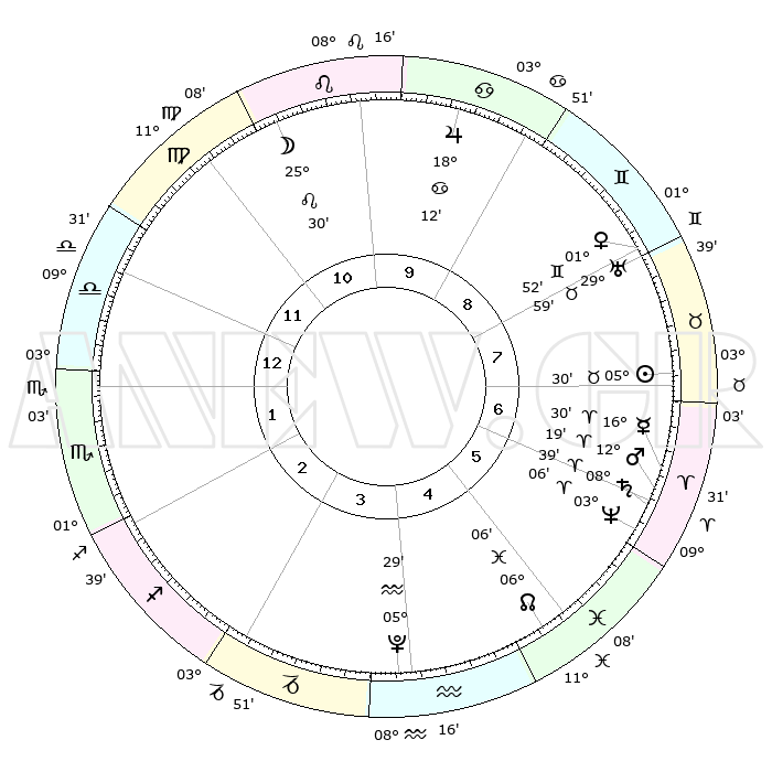 | | ΘΕΣΕΙΣ ΠΛΑΝΗΤΩΝ ΑΣΤΡΟΛΟΓΙΚΟΥ ΧΑΡΤΗ ΤΗΣ ΣΤΙΓΜΗΣ ΑΥΤΗΣ | | | | Πλανήτης | Ζώδιο | Μοίρες | Δεκαήμ. | Σε οίκο | Απόκλιση | | Ακμές των οίκων | | Ηλιος | Ταύρος | 05°27' | Πρώτο | 7 | 13 N 20 | | 1ος | 16°01' | Ζυγός | | Σελήνη | Λέων | 24°43' | Τρίτο | 11 | 14 N 20 | | 2ος | 13°37' | Σκορπιός | | Ερμής | Κριός | 16°24' | Δεύτερο | 7 | 04 N 14 | | 3ος | 14°43' | Τοξότης | | Αφροδίτη | Δίδυμοι | 01°48' | Πρώτο | 8 | 21 N 10 | | 4ος | 18°07' | Αιγόκερως | | Αρης | Κριός | 12°16' | Δεύτερο | 6 | 04 N 00 | | 5ος | 21°03' | Υδροχόος | | Δίας | Καρκίνος | 18°12' | Δεύτερο | 10 | 22 N 35 | | 6ος | 20°45' | Ιχθείς | | Κρόνος | Κριός | 08°39' | Πρώτο | 6 | 01 N 26 | | 7ος | 16°01' | Κριός | | Ουρανός | Ταύρος | 29°59' | Τρίτο | 8 | 19 N 59 | | 8ος | 13°37' | Ταύρος | | Ποσειδώνας | Κριός | 03°05' | Πρώτο | 6 | 00 N 01 | | 9ος | 14°43' | Δίδυμοι | | Πλούτωνας | Υδροχόος | 05°29' | Πρώτο | 4 | 22 S 48 | | 10ος | 18°07' | Καρκίνος | | Β. Δεσμός | Ιχθείς | 06°06' | Πρώτο | 5 | 09 S 16 | | 11ος | 21°03' | Λέων | | Ωροσκόπος | Ζυγός | 16°01' | Δεύτερο | | | 12ος | 20°45' | Παρθένος | | Μεσουράνημα | Καρκίνος | 18°07' | Δεύτερο | | | |