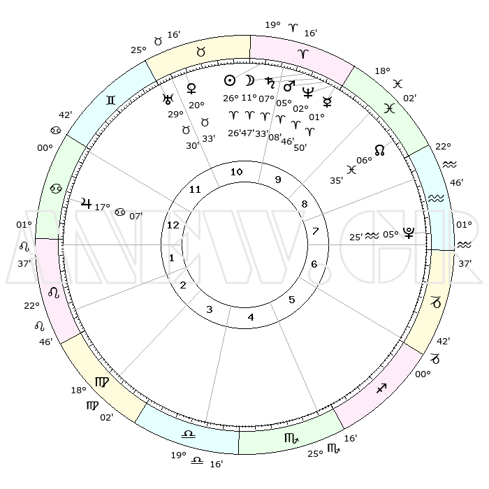 | | ΘΕΣΕΙΣ ΠΛΑΝΗΤΩΝ ΑΣΤΡΟΛΟΓΙΚΟΥ ΧΑΡΤΗ ΤΗΣ ΣΤΙΓΜΗΣ ΑΥΤΗΣ | | | | Πλανήτης | Ζώδιο | Μοίρες | Δεκαήμ. | Σε οίκο | Απόκλιση | | Ακμές των οίκων | | Ηλιος | Κριός | 26°21' | Τρίτο | 11 | 10 N 10 | | 1ος | 06°27' | Καρκίνος | | Σελήνη | Κριός | 10°35' | Δεύτερο | 10 | 06 N 44 | | 2ος | 26°57' | Καρκίνος | | Ερμής | Κριός | 01°42' | Πρώτο | 10 | 01 S 44 | | 3ος | 19°15' | Λέων | | Αφροδίτη | Ταύρος | 20°27' | Τρίτο | 11 | 18 N 05 | | 4ος | 16°37' | Παρθένος | | Αρης | Κριός | 05°04' | Πρώτο | 10 | 01 N 07 | | 5ος | 21°29' | Ζυγός | | Δίας | Καρκίνος | 17°06' | Δεύτερο | 1 | 22 N 43 | | 6ος | 00°53' | Τοξότης | | Κρόνος | Κριός | 07°33' | Πρώτο | 10 | 01 N 01 | | 7ος | 06°27' | Αιγόκερως | | Ουρανός | Ταύρος | 29°30' | Τρίτο | 11 | 19 N 52 | | 8ος | 26°57' | Αιγόκερως | | Ποσειδώνας | Κριός | 02°46' | Πρώτο | 10 | 00 S 06 | | 9ος | 19°15' | Υδροχόος | | Πλούτωνας | Υδροχόος | 05°25' | Πρώτο | 8 | 22 S 47 | | 10ος | 16°37' | Ιχθείς | | Β. Δεσμός | Ιχθείς | 06°35' | Πρώτο | 9 | 09 S 05 | | 11ος | 21°29' | Κριός | | Ωροσκόπος | Καρκίνος | 06°27' | Πρώτο | | | 12ος | 00°53' | Δίδυμοι | | Μεσουράνημα | Ιχθείς | 16°37' | Δεύτερο | | | |