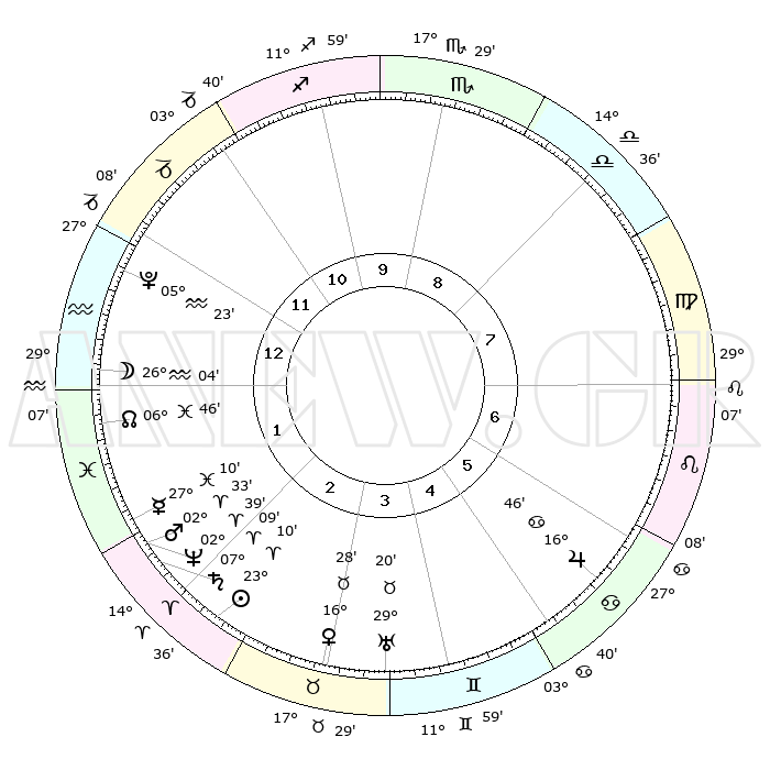 | | ΘΕΣΕΙΣ ΠΛΑΝΗΤΩΝ ΑΣΤΡΟΛΟΓΙΚΟΥ ΧΑΡΤΗ ΤΗΣ ΣΤΙΓΜΗΣ ΑΥΤΗΣ | | | | Πλανήτης | Ζώδιο | Μοίρες | Δεκαήμ. | Σε οίκο | Απόκλιση | | Ακμές των οίκων | | Ηλιος | Κριός | 23°05' | Τρίτο | 3 | 08 N 58 | | 1ος | 24°54' | Αιγόκερως | | Σελήνη | Υδροχόος | 25°07' | Τρίτο | 1 | 14 S 15 | | 2ος | 08°05' | Ιχθείς | | Ερμής | Ιχθείς | 27°04' | Τρίτο | 2 | 03 S 28 | | 3ος | 17°15' | Κριός | | Αφροδίτη | Ταύρος | 16°23' | Δεύτερο | 3 | 16 N 48 | | 4ος | 16°37' | Ταύρος | | Αρης | Κριός | 02°29' | Πρώτο | 2 | 00 N 05 | | 5ος | 09°48' | Δίδυμοι | | Δίας | Καρκίνος | 16°46' | Δεύτερο | 6 | 22 N 45 | | 6ος | 01°04' | Καρκίνος | | Κρόνος | Κριός | 07°08' | Πρώτο | 2 | 00 N 52 | | 7ος | 24°54' | Καρκίνος | | Ουρανός | Ταύρος | 29°19' | Τρίτο | 4 | 19 N 50 | | 8ος | 08°05' | Παρθένος | | Ποσειδώνας | Κριός | 02°39' | Πρώτο | 2 | 00 S 09 | | 9ος | 17°15' | Ζυγός | | Πλούτωνας | Υδροχόος | 05°23' | Πρώτο | 1 | 22 S 47 | | 10ος | 16°37' | Σκορπιός | | Β. Δεσμός | Ιχθείς | 06°46' | Πρώτο | 1 | 09 S 02 | | 11ος | 09°48' | Τοξότης | | Ωροσκόπος | Αιγόκερως | 24°54' | Τρίτο | | | 12ος | 01°04' | Αιγόκερως | | Μεσουράνημα | Σκορπιός | 16°37' | Δεύτερο | | | |