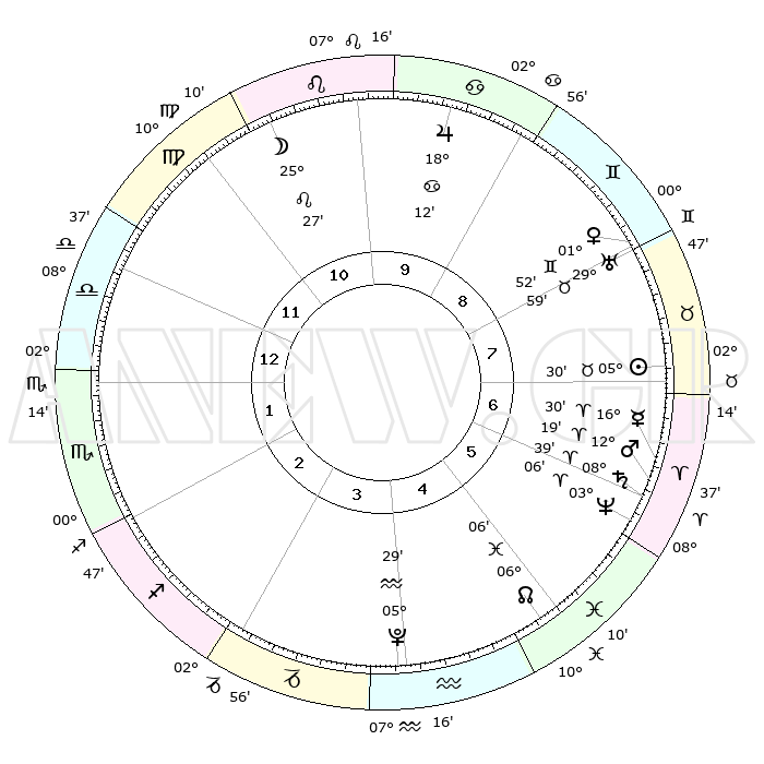 | | ΘΕΣΕΙΣ ΠΛΑΝΗΤΩΝ ΑΣΤΡΟΛΟΓΙΚΟΥ ΧΑΡΤΗ ΤΗΣ ΣΤΙΓΜΗΣ ΑΥΤΗΣ | | | | Πλανήτης | Ζώδιο | Μοίρες | Δεκαήμ. | Σε οίκο | Απόκλιση | | Ακμές των οίκων | | Ηλιος | Ταύρος | 05°26' | Πρώτο | 7 | 13 N 20 | | 1ος | 12°45' | Ζυγός | | Σελήνη | Λέων | 24°34' | Τρίτο | 11 | 14 N 23 | | 2ος | 10°10' | Σκορπιός | | Ερμής | Κριός | 16°23' | Δεύτερο | 7 | 04 N 14 | | 3ος | 11°06' | Τοξότης | | Αφροδίτη | Δίδυμοι | 01°47' | Πρώτο | 8 | 21 N 10 | | 4ος | 14°23' | Αιγόκερως | | Αρης | Κριός | 12°16' | Δεύτερο | 6 | 04 N 00 | | 5ος | 17°19' | Υδροχόος | | Δίας | Καρκίνος | 18°12' | Δεύτερο | 10 | 22 N 35 | | 6ος | 17°11' | Ιχθείς | | Κρόνος | Κριός | 08°39' | Πρώτο | 6 | 01 N 26 | | 7ος | 12°45' | Κριός | | Ουρανός | Ταύρος | 29°59' | Τρίτο | 8 | 19 N 59 | | 8ος | 10°10' | Ταύρος | | Ποσειδώνας | Κριός | 03°05' | Πρώτο | 6 | 00 N 01 | | 9ος | 11°06' | Δίδυμοι | | Πλούτωνας | Υδροχόος | 05°29' | Πρώτο | 4 | 22 S 48 | | 10ος | 14°23' | Καρκίνος | | Β. Δεσμός | Ιχθείς | 06°06' | Πρώτο | 5 | 09 S 16 | | 11ος | 17°19' | Λέων | | Ωροσκόπος | Ζυγός | 12°45' | Δεύτερο | | | 12ος | 17°11' | Παρθένος | | Μεσουράνημα | Καρκίνος | 14°23' | Δεύτερο | | | |