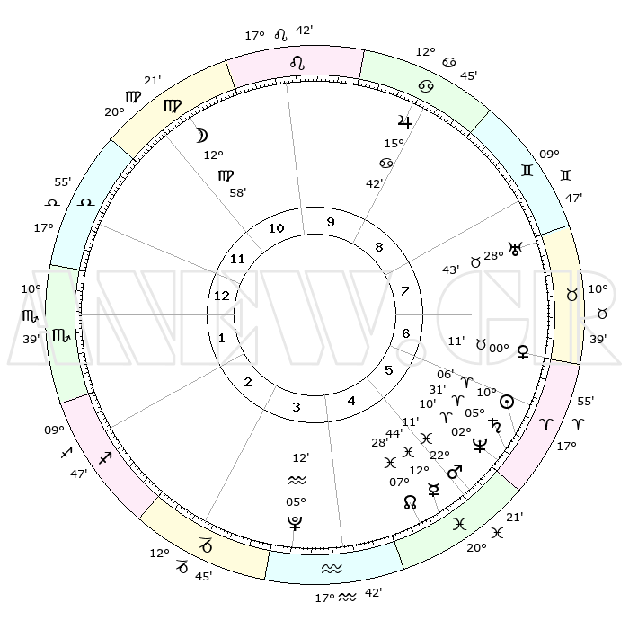 | | ΘΕΣΕΙΣ ΠΛΑΝΗΤΩΝ ΑΣΤΡΟΛΟΓΙΚΟΥ ΧΑΡΤΗ ΤΗΣ ΣΤΙΓΜΗΣ ΑΥΤΗΣ | | | | Πλανήτης | Ζώδιο | Μοίρες | Δεκαήμ. | Σε οίκο | Απόκλιση | | Ακμές των οίκων | | Ηλιος | Κριός | 10°02' | Δεύτερο | 6 | 03 N 58 | | 1ος | 20°51' | Ζυγός | | Σελήνη | Παρθένος | 12°05' | Δεύτερο | 11 | 06 N 45 | | 2ος | 18°44' | Σκορπιός | | Ερμής | Ιχθείς | 12°41' | Δεύτερο | 5 | 07 S 49 | | 3ος | 20°05' | Τοξότης | | Αφροδίτη | Ταύρος | 00°06' | Πρώτο | 7 | 11 N 02 | | 4ος | 23°43' | Αιγόκερως | | Αρης | Ιχθείς | 22°08' | Τρίτο | 5 | 04 S 05 | | 5ος | 26°40' | Υδροχόος | | Δίας | Καρκίνος | 15°42' | Δεύτερο | 9 | 22 N 53 | | 6ος | 26°04' | Ιχθείς | | Κρόνος | Κριός | 05°30' | Πρώτο | 6 | 00 N 14 | | 7ος | 20°51' | Κριός | | Ουρανός | Ταύρος | 28°43' | Τρίτο | 8 | 19 N 42 | | 8ος | 18°44' | Ταύρος | | Ποσειδώνας | Κριός | 02°10' | Πρώτο | 6 | 00 S 20 | | 9ος | 20°05' | Δίδυμοι | | Πλούτωνας | Υδροχόος | 05°12' | Πρώτο | 4 | 22 S 48 | | 10ος | 23°43' | Καρκίνος | | Β. Δεσμός | Ιχθείς | 07°28' | Πρώτο | 5 | 08 S 46 | | 11ος | 26°40' | Λέων | | Ωροσκόπος | Ζυγός | 20°51' | Τρίτο | | | 12ος | 26°04' | Παρθένος | | Μεσουράνημα | Καρκίνος | 23°43' | Τρίτο | | | |