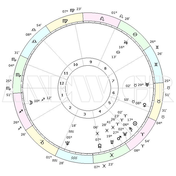 | | ΘΕΣΕΙΣ ΠΛΑΝΗΤΩΝ ΑΣΤΡΟΛΟΓΙΚΟΥ ΧΑΡΤΗ ΤΗΣ ΣΤΙΓΜΗΣ ΑΥΤΗΣ | | | | Πλανήτης | Ζώδιο | Μοίρες | Δεκαήμ. | Σε οίκο | Απόκλιση | | Ακμές των οίκων | | Ηλιος | Κριός | 16°58' | Δεύτερο | 6 | 06 N 40 | | 1ος | 05°56' | Σκορπιός | | Σελήνη | Τοξότης | 09°23' | Πρώτο | 2 | 26 S 57 | | 2ος | 04°43' | Τοξότης | | Ερμής | Ιχθείς | 19°24' | Δεύτερο | 5 | 06 S 05 | | 3ος | 07°11' | Αιγόκερως | | Αφροδίτη | Ταύρος | 08°44' | Πρώτο | 7 | 14 N 13 | | 4ος | 11°48' | Υδροχόος | | Αρης | Ιχθείς | 27°38' | Τρίτο | 5 | 01 S 53 | | 5ος | 14°36' | Ιχθείς | | Δίας | Καρκίνος | 16°12' | Δεύτερο | 9 | 22 N 49 | | 6ος | 12°42' | Κριός | | Κρόνος | Κριός | 06°23' | Πρώτο | 5 | 00 N 34 | | 7ος | 05°56' | Ταύρος | | Ουρανός | Ταύρος | 29°01' | Τρίτο | 7 | 19 N 46 | | 8ος | 04°43' | Δίδυμοι | | Ποσειδώνας | Κριός | 02°26' | Πρώτο | 5 | 00 S 14 | | 9ος | 07°11' | Καρκίνος | | Πλούτωνας | Υδροχόος | 05°18' | Πρώτο | 3 | 22 S 47 | | 10ος | 11°48' | Λέων | | Β. Δεσμός | Ιχθείς | 07°06' | Πρώτο | 4 | 08 S 54 | | 11ος | 14°36' | Παρθένος | | Ωροσκόπος | Σκορπιός | 05°56' | Πρώτο | | | 12ος | 12°42' | Ζυγός | | Μεσουράνημα | Λέων | 11°48' | Δεύτερο | | | |