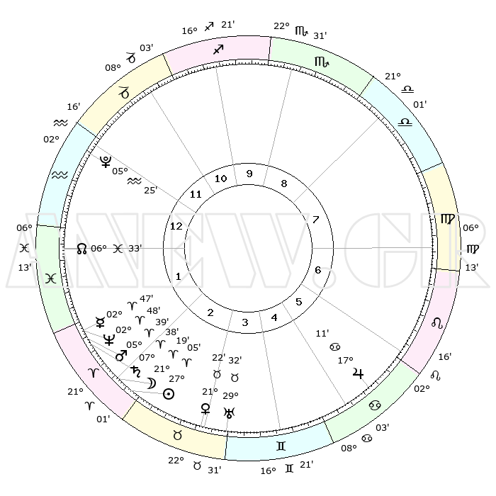 | | ΘΕΣΕΙΣ ΠΛΑΝΗΤΩΝ ΑΣΤΡΟΛΟΓΙΚΟΥ ΧΑΡΤΗ ΤΗΣ ΣΤΙΓΜΗΣ ΑΥΤΗΣ | | | | Πλανήτης | Ζώδιο | Μοίρες | Δεκαήμ. | Σε οίκο | Απόκλιση | | Ακμές των οίκων | | Ηλιος | Κριός | 27°01' | Τρίτο | 2 | 10 N 24 | | 1ος | 06°06' | Υδροχόος | | Σελήνη | Κριός | 20°26' | Τρίτο | 2 | 11 N 11 | | 2ος | 21°04' | Ιχθείς | | Ερμής | Κριός | 02°42' | Πρώτο | 2 | 01 S 21 | | 3ος | 28°29' | Κριός | | Αφροδίτη | Ταύρος | 21°17' | Τρίτο | 3 | 18 N 20 | | 4ος | 25°56' | Ταύρος | | Αρης | Κριός | 05°36' | Πρώτο | 2 | 01 N 20 | | 5ος | 18°18' | Δίδυμοι | | Δίας | Καρκίνος | 17°11' | Δεύτερο | 6 | 22 N 42 | | 6ος | 09°59' | Καρκίνος | | Κρόνος | Κριός | 07°38' | Πρώτο | 2 | 01 N 03 | | 7ος | 06°06' | Λέων | | Ουρανός | Ταύρος | 29°32' | Τρίτο | 4 | 19 N 53 | | 8ος | 21°04' | Παρθένος | | Ποσειδώνας | Κριός | 02°48' | Πρώτο | 2 | 00 S 06 | | 9ος | 28°29' | Ζυγός | | Πλούτωνας | Υδροχόος | 05°25' | Πρώτο | 12 | 22 S 47 | | 10ος | 25°56' | Σκορπιός | | Β. Δεσμός | Ιχθείς | 06°33' | Πρώτο | 1 | 09 S 06 | | 11ος | 18°18' | Τοξότης | | Ωροσκόπος | Υδροχόος | 06°06' | Πρώτο | | | 12ος | 09°59' | Αιγόκερως | | Μεσουράνημα | Σκορπιός | 25°56' | Τρίτο | | | |