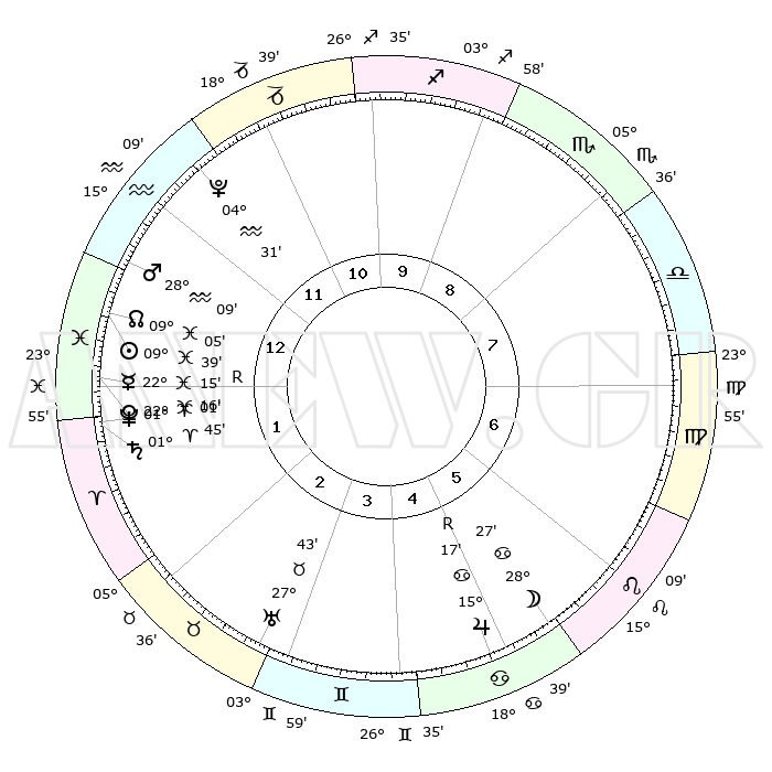 | | ΘΕΣΕΙΣ ΠΛΑΝΗΤΩΝ ΑΣΤΡΟΛΟΓΙΚΟΥ ΧΑΡΤΗ ΤΗΣ ΣΤΙΓΜΗΣ ΑΥΤΗΣ | | | | Πλανήτης | Ζώδιο | Μοίρες | Δεκαήμ. | Σε οίκο | Απόκλιση | | Ακμές των οίκων | | Ηλιος | Ιχθείς | 09°34' | Πρώτο | 1 | 07 S 59 | | 1ος | 16°58' | Υδροχόος | | Σελήνη | Καρκίνος | 27°31' | Τρίτο | 6 | 24 N 05 | | 2ος | 02°44' | Κριός | | Ερμής | Ιχθείς | 22°17'R | Τρίτο | 1 | 00 S 09 | | 3ος | 08°04' | Ταύρος | | Αφροδίτη | Ιχθείς | 22°11' | Τρίτο | 1 | 04 S 21 | | 4ος | 03°57' | Δίδυμοι | | Αρης | Υδροχόος | 28°06' | Τρίτο | 1 | 13 S 09 | | 5ος | 25°51' | Δίδυμοι | | Δίας | Καρκίνος | 15°17'R | Δεύτερο | 5 | 22 N 54 | | 6ος | 18°14' | Καρκίνος | | Κρόνος | Κριός | 01°44' | Πρώτο | 1 | 01 S 16 | | 7ος | 16°58' | Λέων | | Ουρανός | Ταύρος | 27°43' | Τρίτο | 3 | 19 N 28 | | 8ος | 02°44' | Ζυγός | | Ποσειδώνας | Κριός | 01°01' | Πρώτο | 1 | 00 S 48 | | 9ος | 08°04' | Σκορπιός | | Πλούτωνας | Υδροχόος | 04°31' | Πρώτο | 12 | 22 S 53 | | 10ος | 03°57' | Τοξότης | | Β. Δεσμός | Ιχθείς | 09°05' | Πρώτο | 1 | 08 S 10 | | 11ος | 25°51' | Τοξότης | | Ωροσκόπος | Υδροχόος | 16°58' | Δεύτερο | | | 12ος | 18°14' | Αιγόκερως | | Μεσουράνημα | Τοξότης | 03°57' | Πρώτο | | | |