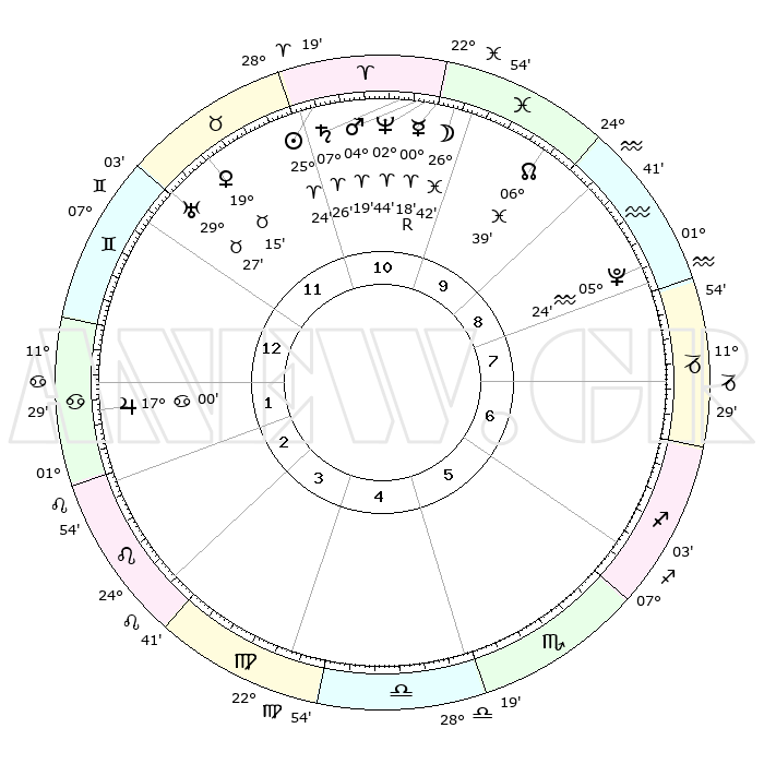 | | ΘΕΣΕΙΣ ΠΛΑΝΗΤΩΝ ΑΣΤΡΟΛΟΓΙΚΟΥ ΧΑΡΤΗ ΤΗΣ ΣΤΙΓΜΗΣ ΑΥΤΗΣ | | | | Πλανήτης | Ζώδιο | Μοίρες | Δεκαήμ. | Σε οίκο | Απόκλιση | | Ακμές των οίκων | | Ηλιος | Κριός | 25°20' | Τρίτο | 11 | 09 N 48 | | 1ος | 21°38' | Δίδυμοι | | Σελήνη | Ιχθείς | 25°52' | Τρίτο | 10 | 00 S 12 | | 2ος | 13°07' | Καρκίνος | | Ερμής | Κριός | 00°13'R | Πρώτο | 10 | 02 S 18 | | 3ος | 04°30' | Λέων | | Αφροδίτη | Ταύρος | 19°11' | Δεύτερο | 12 | 17 N 42 | | 4ος | 29°33' | Λέων | | Αρης | Κριός | 04°16' | Πρώτο | 11 | 00 N 48 | | 5ος | 02°03' | Ζυγός | | Δίας | Καρκίνος | 16°60' | Δεύτερο | 2 | 22 N 44 | | 6ος | 12°21' | Σκορπιός | | Κρόνος | Κριός | 07°25' | Πρώτο | 11 | 00 N 58 | | 7ος | 21°38' | Τοξότης | | Ουρανός | Ταύρος | 29°26' | Τρίτο | 12 | 19 N 52 | | 8ος | 13°07' | Αιγόκερως | | Ποσειδώνας | Κριός | 02°44' | Πρώτο | 11 | 00 S 07 | | 9ος | 04°30' | Υδροχόος | | Πλούτωνας | Υδροχόος | 05°24' | Πρώτο | 9 | 22 S 47 | | 10ος | 29°33' | Υδροχόος | | Β. Δεσμός | Ιχθείς | 06°39' | Πρώτο | 10 | 09 S 04 | | 11ος | 02°03' | Κριός | | Ωροσκόπος | Δίδυμοι | 21°38' | Τρίτο | | | 12ος | 12°21' | Ταύρος | | Μεσουράνημα | Υδροχόος | 29°33' | Τρίτο | | | |