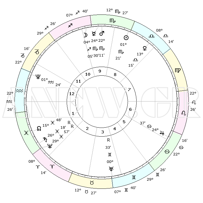 | | ΘΕΣΕΙΣ ΠΛΑΝΗΤΩΝ ΑΣΤΡΟΛΟΓΙΚΟΥ ΧΑΡΤΗ ΤΗΣ ΣΤΙΓΜΗΣ ΑΥΤΗΣ | | | | Πλανήτης | Ζώδιο | Μοίρες | Δεκαήμ. | Σε οίκο | Απόκλιση | | Ακμές των οίκων | | Ηλιος | Σκορπιός | 00°54' | Πρώτο | 2 | 11 S 47 | | 1ος | 23°49' | Παρθένος | | Σελήνη | Σκορπιός | 28°43' | Τρίτο | 3 | 24 S 36 | | 2ος | 19°56' | Ζυγός | | Ερμής | Σκορπιός | 23°57' | Τρίτο | 3 | 21 S 14 | | 3ος | 20°07' | Σκορπιός | | Αφροδίτη | Ζυγός | 12°41' | Δεύτερο | 1 | 03 S 36 | | 4ος | 23°03' | Τοξότης | | Αρης | Σκορπιός | 21°51' | Τρίτο | 3 | 18 S 32 | | 5ος | 26°08' | Αιγόκερως | | Δίας | Καρκίνος | 24°35' | Τρίτο | 10 | 21 N 16 | | 6ος | 26°48' | Υδροχόος | | Κρόνος | Ιχθείς | 26°20'R | Τρίτο | 7 | 03 S 44 | | 7ος | 23°49' | Ιχθείς | | Ουρανός | Δίδυμοι | 00°34'R | Πρώτο | 9 | 20 N 03 | | 8ος | 19°56' | Κριός | | Ποσειδώνας | Ιχθείς | 29°57'R | Τρίτο | 7 | 01 S 17 | | 9ος | 20°07' | Ταύρος | | Πλούτωνας | Υδροχόος | 01°23' | Πρώτο | 5 | 23 S 32 | | 10ος | 23°03' | Δίδυμοι | | Β. Δεσμός | Ιχθείς | 15°49' | Δεύτερο | 6 | 05 S 35 | | 11ος | 26°08' | Καρκίνος | | Ωροσκόπος | Παρθένος | 23°49' | Τρίτο | | | 12ος | 26°48' | Λέων | | Μεσουράνημα | Δίδυμοι | 23°03' | Τρίτο | | | |