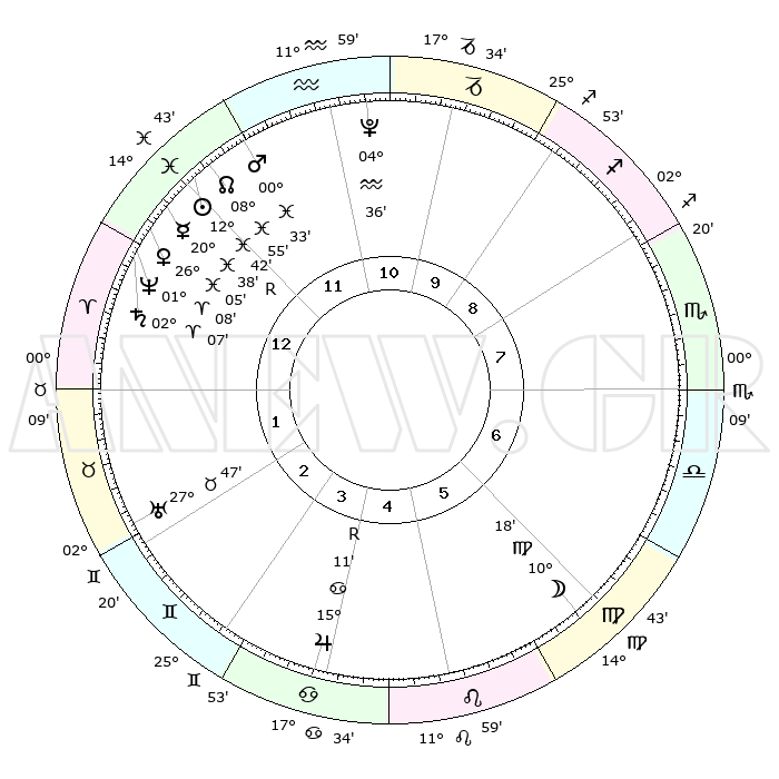| | ΘΕΣΕΙΣ ΠΛΑΝΗΤΩΝ ΑΣΤΡΟΛΟΓΙΚΟΥ ΧΑΡΤΗ ΤΗΣ ΣΤΙΓΜΗΣ ΑΥΤΗΣ | | | | Πλανήτης | Ζώδιο | Μοίρες | Δεκαήμ. | Σε οίκο | Απόκλιση | | Ακμές των οίκων | | Ηλιος | Ιχθείς | 12°39' | Δεύτερο | 12 | 06 S 49 | | 1ος | 27°06' | Ιχθείς | | Σελήνη | Παρθένος | 09°32' | Πρώτο | 6 | 07 N 57 | | 2ος | 08°05' | Ταύρος | | Ερμής | Ιχθείς | 20°40'R | Τρίτο | 12 | 00 S 24 | | 3ος | 05°56' | Δίδυμοι | | Αφροδίτη | Ιχθείς | 26°00' | Τρίτο | 12 | 02 S 48 | | 4ος | 28°22' | Δίδυμοι | | Αρης | Ιχθείς | 00°31' | Πρώτο | 12 | 12 S 19 | | 5ος | 20°33' | Καρκίνος | | Δίας | Καρκίνος | 15°11'R | Δεύτερο | 4 | 22 N 55 | | 6ος | 17°31' | Λέων | | Κρόνος | Κριός | 02°06' | Πρώτο | 1 | 01 S 07 | | 7ος | 27°06' | Παρθένος | | Ουρανός | Ταύρος | 27°47' | Τρίτο | 2 | 19 N 29 | | 8ος | 08°05' | Σκορπιός | | Ποσειδώνας | Κριός | 01°08' | Πρώτο | 1 | 00 S 45 | | 9ος | 05°56' | Τοξότης | | Πλούτωνας | Υδροχόος | 04°36' | Πρώτο | 11 | 22 S 52 | | 10ος | 28°22' | Τοξότης | | Β. Δεσμός | Ιχθείς | 08°56' | Πρώτο | 12 | 08 S 13 | | 11ος | 20°33' | Αιγόκερως | | Ωροσκόπος | Ιχθείς | 27°06' | Τρίτο | | | 12ος | 17°31' | Υδροχόος | | Μεσουράνημα | Τοξότης | 28°22' | Τρίτο | | | |
