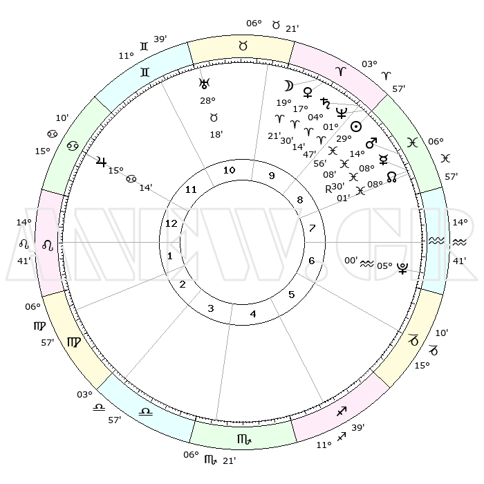 | | ΘΕΣΕΙΣ ΠΛΑΝΗΤΩΝ ΑΣΤΡΟΛΟΓΙΚΟΥ ΧΑΡΤΗ ΤΗΣ ΣΤΙΓΜΗΣ ΑΥΤΗΣ | | | | Πλανήτης | Ζώδιο | Μοίρες | Δεκαήμ. | Σε οίκο | Απόκλιση | | Ακμές των οίκων | | Ηλιος | Ιχθείς | 29°51' | Τρίτο | 9 | 00 S 04 | | 1ος | 22°35' | Καρκίνος | | Σελήνη | Κριός | 18°16' | Δεύτερο | 10 | 10 N 15 | | 2ος | 13°13' | Λέων | | Ερμής | Ιχθείς | 08°30'R | Πρώτο | 9 | 07 S 23 | | 3ος | 07°17' | Παρθένος | | Αφροδίτη | Κριός | 17°24' | Δεύτερο | 10 | 06 N 01 | | 4ος | 07°18' | Ζυγός | | Αρης | Ιχθείς | 14°04' | Δεύτερο | 9 | 07 S 15 | | 5ος | 13°22' | Σκορπιός | | Δίας | Καρκίνος | 15°14' | Δεύτερο | 12 | 22 N 55 | | 6ος | 20°19' | Τοξότης | | Κρόνος | Κριός | 04°13' | Πρώτο | 9 | 00 S 16 | | 7ος | 22°35' | Αιγόκερως | | Ουρανός | Ταύρος | 28°18' | Τρίτο | 11 | 19 N 36 | | 8ος | 13°13' | Υδροχόος | | Ποσειδώνας | Κριός | 01°46' | Πρώτο | 9 | 00 S 30 | | 9ος | 07°17' | Ιχθείς | | Πλούτωνας | Υδροχόος | 05°00' | Πρώτο | 7 | 22 S 49 | | 10ος | 07°18' | Κριός | | Β. Δεσμός | Ιχθείς | 08°01' | Πρώτο | 9 | 08 S 34 | | 11ος | 13°22' | Ταύρος | | Ωροσκόπος | Καρκίνος | 22°35' | Τρίτο | | | 12ος | 20°19' | Δίδυμοι | | Μεσουράνημα | Κριός | 07°18' | Πρώτο | | | |