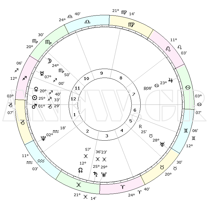 | | ΘΕΣΕΙΣ ΠΛΑΝΗΤΩΝ ΑΣΤΡΟΛΟΓΙΚΟΥ ΧΑΡΤΗ ΤΗΣ ΣΤΙΓΜΗΣ ΑΥΤΗΣ | | | | Πλανήτης | Ζώδιο | Μοίρες | Δεκαήμ. | Σε οίκο | Απόκλιση | | Ακμές των οίκων | | Ηλιος | Τοξότης | 25°28' | Τρίτο | 1 | 23 S 21 | | 1ος | 04°18' | Τοξότης | | Σελήνη | Σκορπιός | 23°45' | Τρίτο | 12 | 23 S 17 | | 2ος | 06°04' | Αιγόκερως | | Ερμής | Τοξότης | 06°53' | Πρώτο | 1 | 20 S 12 | | 3ος | 12°29' | Υδροχόος | | Αφροδίτη | Τοξότης | 20°33' | Τρίτο | 1 | 23 S 01 | | 4ος | 18°35' | Ιχθείς | | Αρης | Αιγόκερως | 01°24' | Πρώτο | 1 | 24 S 13 | | 5ος | 19°03' | Κριός | | Δίας | Καρκίνος | 23°08'R | Τρίτο | 8 | 21 N 39 | | 6ος | 13°31' | Ταύρος | | Κρόνος | Ιχθείς | 25°36' | Τρίτο | 4 | 03 S 52 | | 7ος | 04°18' | Δίδυμοι | | Ουρανός | Ταύρος | 28°25'R | Τρίτο | 6 | 19 N 36 | | 8ος | 06°04' | Καρκίνος | | Ποσειδώνας | Ιχθείς | 29°23' | Τρίτο | 4 | 01 S 29 | | 9ος | 12°29' | Λέων | | Πλούτωνας | Υδροχόος | 02°18' | Πρώτο | 2 | 23 S 19 | | 10ος | 18°35' | Παρθένος | | Β. Δεσμός | Ιχθείς | 12°57' | Δεύτερο | 3 | 06 S 42 | | 11ος | 19°03' | Ζυγός | | Ωροσκόπος | Τοξότης | 04°18' | Πρώτο | | | 12ος | 13°31' | Σκορπιός | | Μεσουράνημα | Παρθένος | 18°35' | Δεύτερο | | | |