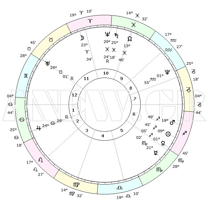 | | ΘΕΣΕΙΣ ΠΛΑΝΗΤΩΝ ΑΣΤΡΟΛΟΓΙΚΟΥ ΧΑΡΤΗ ΤΗΣ ΣΤΙΓΜΗΣ ΑΥΤΗΣ | | | | Πλανήτης | Ζώδιο | Μοίρες | Δεκαήμ. | Σε οίκο | Απόκλιση | | Ακμές των οίκων | | Ηλιος | Τοξότης | 09°43' | Πρώτο | 6 | 21 S 54 | | 1ος | 23°52' | Δίδυμοι | | Σελήνη | Κριός | 23°06' | Τρίτο | 11 | 11 N 54 | | 2ος | 15°08' | Καρκίνος | | Ερμής | Σκορπιός | 21°02' | Τρίτο | 6 | 15 S 29 | | 3ος | 06°36' | Λέων | | Αφροδίτη | Τοξότης | 01°03' | Πρώτο | 6 | 19 S 42 | | 4ος | 01°59' | Παρθένος | | Αρης | Τοξότης | 19°48' | Δεύτερο | 6 | 23 S 42 | | 5ος | 04°52' | Ζυγός | | Δίας | Καρκίνος | 24°29'R | Τρίτο | 2 | 21 N 23 | | 6ος | 15°09' | Σκορπιός | | Κρόνος | Ιχθείς | 25°18' | Τρίτο | 10 | 04 S 03 | | 7ος | 23°52' | Τοξότης | | Ουρανός | Ταύρος | 29°01'R | Τρίτο | 12 | 19 N 44 | | 8ος | 15°08' | Αιγόκερως | | Ποσειδώνας | Ιχθείς | 29°24'R | Τρίτο | 10 | 01 S 29 | | 9ος | 06°36' | Υδροχόος | | Πλούτωνας | Υδροχόος | 01°55' | Πρώτο | 8 | 23 S 24 | | 10ος | 01°59' | Ιχθείς | | Β. Δεσμός | Ιχθείς | 13°47' | Δεύτερο | 10 | 06 S 23 | | 11ος | 04°52' | Κριός | | Ωροσκόπος | Δίδυμοι | 23°52' | Τρίτο | | | 12ος | 15°09' | Ταύρος | | Μεσουράνημα | Ιχθείς | 01°59' | Πρώτο | | | |