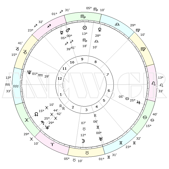 | | ΘΕΣΕΙΣ ΠΛΑΝΗΤΩΝ ΑΣΤΡΟΛΟΓΙΚΟΥ ΧΑΡΤΗ ΤΗΣ ΣΤΙΓΜΗΣ ΑΥΤΗΣ | | | | Πλανήτης | Ζώδιο | Μοίρες | Δεκαήμ. | Σε οίκο | Απόκλιση | | Ακμές των οίκων | | Ηλιος | Σκορπιός | 13°11' | Δεύτερο | 10 | 15 S 48 | | 1ος | 29°50' | Τοξότης | | Σελήνη | Ταύρος | 10°25' | Δεύτερο | 4 | 18 N 49 | | 2ος | 06°56' | Υδροχόος | | Ερμής | Τοξότης | 05°35' | Πρώτο | 11 | 23 S 59 | | 3ος | 16°55' | Ιχθείς | | Αφροδίτη | Ζυγός | 28°02' | Τρίτο | 10 | 09 S 27 | | 4ος | 20°53' | Κριός | | Αρης | Τοξότης | 00°36' | Πρώτο | 11 | 20 S 42 | | 5ος | 17°14' | Ταύρος | | Δίας | Καρκίνος | 25°05' | Τρίτο | 7 | 21 N 12 | | 6ος | 09°03' | Δίδυμοι | | Κρόνος | Ιχθείς | 25°44'R | Τρίτο | 3 | 03 S 57 | | 7ος | 29°50' | Δίδυμοι | | Ουρανός | Δίδυμοι | 00°06'R | Πρώτο | 5 | 19 N 58 | | 8ος | 06°56' | Λέων | | Ποσειδώνας | Ιχθείς | 29°42'R | Τρίτο | 3 | 01 S 22 | | 9ος | 16°55' | Παρθένος | | Πλούτωνας | Υδροχόος | 01°29' | Πρώτο | 1 | 23 S 30 | | 10ος | 20°53' | Ζυγός | | Β. Δεσμός | Ιχθείς | 15°10' | Δεύτερο | 2 | 05 S 51 | | 11ος | 17°14' | Σκορπιός | | Ωροσκόπος | Τοξότης | 29°50' | Τρίτο | | | 12ος | 09°03' | Τοξότης | | Μεσουράνημα | Ζυγός | 20°53' | Τρίτο | | | |