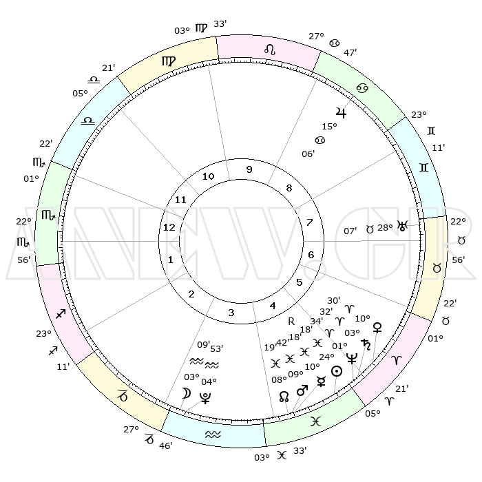 | | ΘΕΣΕΙΣ ΠΛΑΝΗΤΩΝ ΑΣΤΡΟΛΟΓΙΚΟΥ ΧΑΡΤΗ ΤΗΣ ΣΤΙΓΜΗΣ ΑΥΤΗΣ | | | | Πλανήτης | Ζώδιο | Μοίρες | Δεκαήμ. | Σε οίκο | Απόκλιση | | Ακμές των οίκων | | Ηλιος | Ιχθείς | 24°15' | Τρίτο | 5 | 02 S 17 | | 1ος | 05°26' | Σκορπιός | | Σελήνη | Υδροχόος | 02°23' | Πρώτο | 3 | 22 S 41 | | 2ος | 04°12' | Τοξότης | | Ερμής | Ιχθείς | 10°21'R | Δεύτερο | 4 | 05 S 25 | | 3ος | 06°37' | Αιγόκερως | | Αφροδίτη | Κριός | 10°25' | Δεύτερο | 5 | 03 N 09 | | 4ος | 11°12' | Υδροχόος | | Αρης | Ιχθείς | 09°39' | Πρώτο | 4 | 08 S 57 | | 5ος | 14°01' | Ιχθείς | | Δίας | Καρκίνος | 15°06' | Δεύτερο | 9 | 22 N 56 | | 6ος | 12°09' | Κριός | | Κρόνος | Κριός | 03°31' | Πρώτο | 5 | 00 S 33 | | 7ος | 05°26' | Ταύρος | | Ουρανός | Ταύρος | 28°06' | Τρίτο | 7 | 19 N 34 | | 8ος | 04°12' | Δίδυμοι | | Ποσειδώνας | Κριός | 01°34' | Πρώτο | 5 | 00 S 35 | | 9ος | 06°37' | Καρκίνος | | Πλούτωνας | Υδροχόος | 04°53' | Πρώτο | 3 | 22 S 49 | | 10ος | 11°12' | Λέων | | Β. Δεσμός | Ιχθείς | 08°19' | Πρώτο | 4 | 08 S 27 | | 11ος | 14°01' | Παρθένος | | Ωροσκόπος | Σκορπιός | 05°26' | Πρώτο | | | 12ος | 12°09' | Ζυγός | | Μεσουράνημα | Λέων | 11°12' | Δεύτερο | | | |