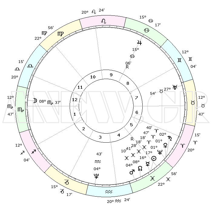 | | ΘΕΣΕΙΣ ΠΛΑΝΗΤΩΝ ΑΣΤΡΟΛΟΓΙΚΟΥ ΧΑΡΤΗ ΤΗΣ ΣΤΙΓΜΗΣ ΑΥΤΗΣ | | | | Πλανήτης | Ζώδιο | Μοίρες | Δεκαήμ. | Σε οίκο | Απόκλιση | | Ακμές των οίκων | | Ηλιος | Ιχθείς | 17°15' | Δεύτερο | 5 | 05 S 02 | | 1ος | 26°27' | Ζυγός | | Σελήνη | Σκορπιός | 07°56' | Πρώτο | 1 | 18 S 25 | | 2ος | 24°39' | Σκορπιός | | Ερμής | Ιχθείς | 16°31'R | Δεύτερο | 5 | 01 S 59 | | 3ος | 26°20' | Τοξότης | | Αφροδίτη | Κριός | 01°43' | Πρώτο | 5 | 00 S 27 | | 4ος | 00°18' | Υδροχόος | | Αρης | Ιχθείς | 04°07' | Πρώτο | 5 | 11 S 01 | | 5ος | 03°15' | Ιχθείς | | Δίας | Καρκίνος | 15°06'R | Δεύτερο | 9 | 22 N 56 | | 6ος | 02°13' | Κριός | | Κρόνος | Κριός | 02°40' | Πρώτο | 6 | 00 S 54 | | 7ος | 26°27' | Κριός | | Ουρανός | Ταύρος | 27°54' | Τρίτο | 8 | 19 N 31 | | 8ος | 24°39' | Ταύρος | | Ποσειδώνας | Κριός | 01°18' | Πρώτο | 5 | 00 S 41 | | 9ος | 26°20' | Δίδυμοι | | Πλούτωνας | Υδροχόος | 04°43' | Πρώτο | 4 | 22 S 51 | | 10ος | 00°18' | Λέων | | Β. Δεσμός | Ιχθείς | 08°41' | Πρώτο | 5 | 08 S 19 | | 11ος | 03°15' | Παρθένος | | Ωροσκόπος | Ζυγός | 26°27' | Τρίτο | | | 12ος | 02°13' | Ζυγός | | Μεσουράνημα | Λέων | 00°18' | Πρώτο | | | |
