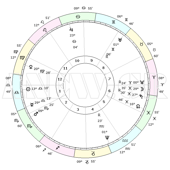 | ΘΕΣΕΙΣ ΠΛΑΝΗΤΩΝ ΑΣΤΡΟΛΟΓΙΚΟΥ ΧΑΡΤΗ ΤΗΣ ΣΤΙΓΜΗΣ ΑΥΤΗΣ | | Πλανήτης | Ζώδιο | Μοίρες | Δεκαήμ. | Σε οίκο | Απόκλιση | | Ακμές των οίκων | Ηλιος | Ζυγός | 13°04' | Δεύτερο | 2 | 05 S 10 | | 1ος | 10°23' | Παρθένος | Σελήνη | Ιχθείς | 28°10' | Τρίτο | 7 | 00 N 06 | | 2ος | 05°18' | Ζυγός | Ερμής | Ζυγός | 29°05' | Τρίτο | 2 | 11 S 48 | | 3ος | 04°47' | Σκορπιός | Αφροδίτη | Παρθένος | 20°20' | Τρίτο | 1 | 05 N 06 | | 4ος | 07°44' | Τοξότης | Αρης | Σκορπιός | 09°21' | Πρώτο | 3 | 14 S 44 | | 5ος | 11°18' | Αιγόκερως | Δίας | Καρκίνος | 23°03' | Τρίτο | 11 | 21 N 30 | | 6ος | 12°34' | Υδροχόος | Κρόνος | Ιχθείς | 27°31'R | Τρίτο | 7 | 03 S 18 | | 7ος | 10°23' | Ιχθείς | Ουρανός | Δίδυμοι | 01°06'R | Πρώτο | 9 | 20 N 10 | | 8ος | 05°18' | Κριός | Ποσειδώνας | Κριός | 00°25'R | Πρώτο | 7 | 01 S 06 | | 9ος | 04°47' | Ταύρος | Πλούτωνας | Υδροχόος | 01°23'R | Πρώτο | 5 | 23 S 32 | | 10ος | 07°44' | Δίδυμοι | Β. Δεσμός | Ιχθείς | 16°46' | Δεύτερο | 7 | 05 S 13 | | 11ος | 11°18' | Καρκίνος | Ωροσκόπος | Παρθένος | 10°23' | Δεύτερο | | | 12ος | 12°34' | Λέων | Μεσουράνημα | Δίδυμοι | 07°44' | Πρώτο | | | |