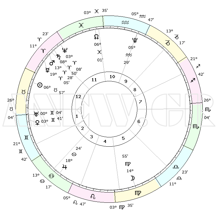 | | ΘΕΣΕΙΣ ΠΛΑΝΗΤΩΝ ΑΣΤΡΟΛΟΓΙΚΟΥ ΧΑΡΤΗ ΤΗΣ ΣΤΙΓΜΗΣ ΑΥΤΗΣ | | | | Πλανήτης | Ζώδιο | Μοίρες | Δεκαήμ. | Σε οίκο | Απόκλιση | | Ακμές των οίκων | | Ηλιος | Ταύρος | 06°54' | Πρώτο | 1 | 13 N 49 | | 1ος | 02°06' | Ταύρος | | Σελήνη | Παρθένος | 14°17' | Δεύτερο | 5 | 05 N 37 | | 2ος | 03°45' | Δίδυμοι | | Ερμής | Κριός | 19°00' | Δεύτερο | 12 | 05 N 20 | | 3ος | 27°06' | Δίδυμοι | | Αφροδίτη | Δίδυμοι | 03°37' | Πρώτο | 1 | 21 N 35 | | 4ος | 18°48' | Καρκίνος | | Αρης | Κριός | 13°25' | Δεύτερο | 12 | 04 N 27 | | 5ος | 13°24' | Λέων | | Δίας | Καρκίνος | 18°24' | Δεύτερο | 3 | 22 N 33 | | 6ος | 16°32' | Παρθένος | | Κρόνος | Κριός | 08°49' | Πρώτο | 12 | 01 N 30 | | 7ος | 02°06' | Σκορπιός | | Ουρανός | Δίδυμοι | 00°04' | Πρώτο | 1 | 20 N 00 | | 8ος | 03°45' | Τοξότης | | Ποσειδώνας | Κριός | 03°08' | Πρώτο | 12 | 00 N 02 | | 9ος | 27°06' | Τοξότης | | Πλούτωνας | Υδροχόος | 05°29' | Πρώτο | 10 | 22 S 48 | | 10ος | 18°48' | Αιγόκερως | | Β. Δεσμός | Ιχθείς | 06°01' | Πρώτο | 11 | 09 S 18 | | 11ος | 13°24' | Υδροχόος | | Ωροσκόπος | Ταύρος | 02°06' | Πρώτο | | | 12ος | 16°32' | Ιχθείς | | Μεσουράνημα | Αιγόκερως | 18°48' | Δεύτερο | | | |