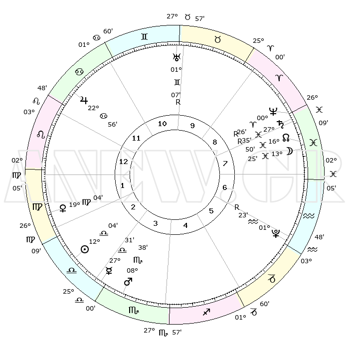 | ΘΕΣΕΙΣ ΠΛΑΝΗΤΩΝ ΑΣΤΡΟΛΟΓΙΚΟΥ ΧΑΡΤΗ ΤΗΣ ΣΤΙΓΜΗΣ ΑΥΤΗΣ | | Πλανήτης | Ζώδιο | Μοίρες | Δεκαήμ. | Σε οίκο | Απόκλιση | | Ακμές των οίκων | Ηλιος | Ζυγός | 11°58' | Δεύτερο | 3 | 04 S 44 | | 1ος | 02°28' | Λέων | Σελήνη | Ιχθείς | 11°59' | Δεύτερο | 8 | 07 S 36 | | 2ος | 23°41' | Λέων | Ερμής | Ζυγός | 27°21' | Τρίτο | 4 | 11 S 04 | | 3ος | 19°04' | Παρθένος | Αφροδίτη | Παρθένος | 18°57' | Δεύτερο | 2 | 05 N 38 | | 4ος | 20°24' | Ζυγός | Αρης | Σκορπιός | 08°34' | Πρώτο | 4 | 14 S 28 | | 5ος | 26°22' | Σκορπιός | Δίας | Καρκίνος | 22°56' | Τρίτο | 12 | 21 N 31 | | 6ος | 01°40' | Αιγόκερως | Κρόνος | Ιχθείς | 27°36'R | Τρίτο | 9 | 03 S 16 | | 7ος | 02°28' | Υδροχόος | Ουρανός | Δίδυμοι | 01°07'R | Πρώτο | 11 | 20 N 10 | | 8ος | 23°41' | Υδροχόος | Ποσειδώνας | Κριός | 00°26'R | Πρώτο | 9 | 01 S 05 | | 9ος | 19°04' | Ιχθείς | Πλούτωνας | Υδροχόος | 01°23'R | Πρώτο | 6 | 23 S 32 | | 10ος | 20°24' | Κριός | Β. Δεσμός | Ιχθείς | 16°50' | Δεύτερο | 8 | 05 S 12 | | 11ος | 26°22' | Ταύρος | Ωροσκόπος | Λέων | 02°28' | Πρώτο | | | 12ος | 01°40' | Καρκίνος | Μεσουράνημα | Κριός | 20°24' | Τρίτο | | | |