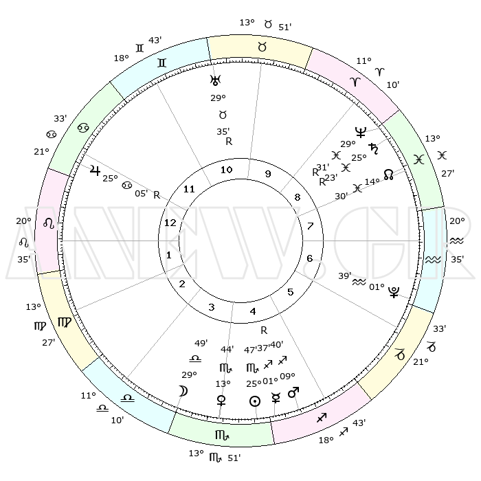 | | ΘΕΣΕΙΣ ΠΛΑΝΗΤΩΝ ΑΣΤΡΟΛΟΓΙΚΟΥ ΧΑΡΤΗ ΤΗΣ ΣΤΙΓΜΗΣ ΑΥΤΗΣ | | | | Πλανήτης | Ζώδιο | Μοίρες | Δεκαήμ. | Σε οίκο | Απόκλιση | | Ακμές των οίκων | | Ηλιος | Σκορπιός | 25°42' | Τρίτο | 5 | 19 S 11 | | 1ος | 27°11' | Καρκίνος | | Σελήνη | Ζυγός | 28°51' | Τρίτο | 4 | 14 S 16 | | 2ος | 18°03' | Λέων | | Ερμής | Τοξότης | 01°43'R | Πρώτο | 5 | 20 S 50 | | 3ος | 12°43' | Παρθένος | | Αφροδίτη | Σκορπιός | 13°38' | Δεύτερο | 4 | 14 S 51 | | 4ος | 13°23' | Ζυγός | | Αρης | Τοξότης | 09°36' | Πρώτο | 5 | 22 S 26 | | 5ος | 19°28' | Σκορπιός | | Δίας | Καρκίνος | 25°05'R | Τρίτο | 12 | 21 N 14 | | 6ος | 25°39' | Τοξότης | | Κρόνος | Ιχθείς | 25°23'R | Τρίτο | 9 | 04 S 03 | | 7ος | 27°11' | Αιγόκερως | | Ουρανός | Ταύρος | 29°36'R | Τρίτο | 11 | 19 N 51 | | 8ος | 18°03' | Υδροχόος | | Ποσειδώνας | Ιχθείς | 29°31'R | Τρίτο | 9 | 01 S 26 | | 9ος | 12°43' | Ιχθείς | | Πλούτωνας | Υδροχόος | 01°39' | Πρώτο | 7 | 23 S 28 | | 10ος | 13°23' | Κριός | | Β. Δεσμός | Ιχθείς | 14°31' | Δεύτερο | 9 | 06 S 06 | | 11ος | 19°29' | Ταύρος | | Ωροσκόπος | Καρκίνος | 27°11' | Τρίτο | | | 12ος | 25°39' | Δίδυμοι | | Μεσουράνημα | Κριός | 13°23' | Δεύτερο | | | |