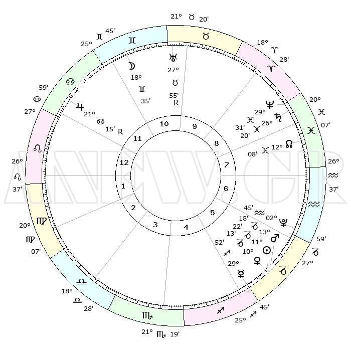 | | ΘΕΣΕΙΣ ΠΛΑΝΗΤΩΝ ΑΣΤΡΟΛΟΓΙΚΟΥ ΧΑΡΤΗ ΤΗΣ ΣΤΙΓΜΗΣ ΑΥΤΗΣ | | | | Πλανήτης | Ζώδιο | Μοίρες | Δεκαήμ. | Σε οίκο | Απόκλιση | | Ακμές των οίκων | | Ηλιος | Αιγόκερως | 11°18' | Δεύτερο | 6 | 22 S 57 | | 1ος | 05°41' | Λέων | | Σελήνη | Δίδυμοι | 17°29' | Δεύτερο | 11 | 27 N 51 | | 2ος | 27°09' | Λέων | | Ερμής | Τοξότης | 29°45' | Τρίτο | 5 | 24 S 05 | | 3ος | 22°58' | Παρθένος | | Αφροδίτη | Αιγόκερως | 10°07' | Δεύτερο | 6 | 23 S 35 | | 4ος | 24°39' | Ζυγός | | Αρης | Αιγόκερως | 13°15' | Δεύτερο | 6 | 23 S 40 | | 5ος | 00°29' | Τοξότης | | Δίας | Καρκίνος | 21°15'R | Τρίτο | 12 | 21 N 59 | | 6ος | 05°17' | Αιγόκερως | | Κρόνος | Ιχθείς | 26°20' | Τρίτο | 9 | 03 S 32 | | 7ος | 05°41' | Υδροχόος | | Ουρανός | Ταύρος | 27°55'R | Τρίτο | 10 | 19 N 30 | | 8ος | 27°09' | Υδροχόος | | Ποσειδώνας | Ιχθείς | 29°31' | Τρίτο | 9 | 01 S 25 | | 9ος | 22°58' | Ιχθείς | | Πλούτωνας | Υδροχόος | 02°45' | Πρώτο | 6 | 23 S 13 | | 10ος | 24°39' | Κριός | | Β. Δεσμός | Ιχθείς | 12°08' | Δεύτερο | 8 | 07 S 01 | | 11ος | 00°29' | Δίδυμοι | | Ωροσκόπος | Λέων | 05°41' | Πρώτο | | | 12ος | 05°17' | Καρκίνος | | Μεσουράνημα | Κριός | 24°39' | Τρίτο | | | |