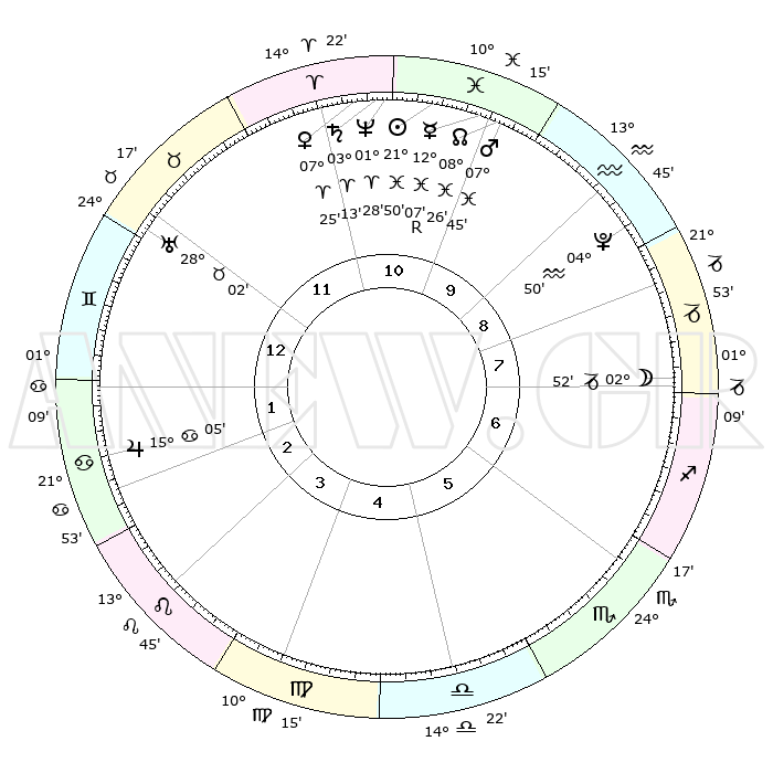 | | ΘΕΣΕΙΣ ΠΛΑΝΗΤΩΝ ΑΣΤΡΟΛΟΓΙΚΟΥ ΧΑΡΤΗ ΤΗΣ ΣΤΙΓΜΗΣ ΑΥΤΗΣ | | | | Πλανήτης | Ζώδιο | Μοίρες | Δεκαήμ. | Σε οίκο | Απόκλιση | | Ακμές των οίκων | | Ηλιος | Ιχθείς | 21°46' | Τρίτο | 11 | 03 S 16 | | 1ος | 07°44' | Δίδυμοι | | Σελήνη | Αιγόκερως | 02°05' | Πρώτο | 8 | 28 S 16 | | 2ος | 01°06' | Καρκίνος | | Ερμής | Ιχθείς | 12°10'R | Δεύτερο | 10 | 04 S 14 | | 3ος | 22°20' | Καρκίνος | | Αφροδίτη | Κριός | 07°20' | Πρώτο | 11 | 01 N 53 | | 4ος | 15°45' | Λέων | | Αρης | Ιχθείς | 07°41' | Πρώτο | 10 | 09 S 42 | | 5ος | 15°36' | Παρθένος | | Δίας | Καρκίνος | 15°05' | Δεύτερο | 2 | 22 N 56 | | 6ος | 25°06' | Ζυγός | | Κρόνος | Κριός | 03°13' | Πρώτο | 11 | 00 S 40 | | 7ος | 07°44' | Τοξότης | | Ουρανός | Ταύρος | 28°02' | Τρίτο | 12 | 19 N 33 | | 8ος | 01°06' | Αιγόκερως | | Ποσειδώνας | Κριός | 01°28' | Πρώτο | 11 | 00 S 37 | | 9ος | 22°20' | Αιγόκερως | | Πλούτωνας | Υδροχόος | 04°49' | Πρώτο | 9 | 22 S 50 | | 10ος | 15°45' | Υδροχόος | | Β. Δεσμός | Ιχθείς | 08°27' | Πρώτο | 10 | 08 S 24 | | 11ος | 15°36' | Ιχθείς | | Ωροσκόπος | Δίδυμοι | 07°44' | Πρώτο | | | 12ος | 25°06' | Κριός | | Μεσουράνημα | Υδροχόος | 15°45' | Δεύτερο | | | |