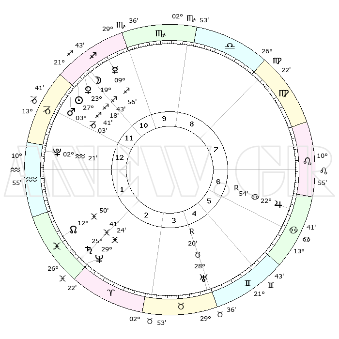 | | ΘΕΣΕΙΣ ΠΛΑΝΗΤΩΝ ΑΣΤΡΟΛΟΓΙΚΟΥ ΧΑΡΤΗ ΤΗΣ ΣΤΙΓΜΗΣ ΑΥΤΗΣ | | | | Πλανήτης | Ζώδιο | Μοίρες | Δεκαήμ. | Σε οίκο | Απόκλιση | | Ακμές των οίκων | | Ηλιος | Τοξότης | 27°37' | Τρίτο | 12 | 23 S 25 | | 1ος | 13°05' | Αιγόκερως | | Σελήνη | Τοξότης | 18°55' | Δεύτερο | 11 | 27 S 55 | | 2ος | 23°34' | Υδροχόος | | Ερμής | Τοξότης | 09°50' | Πρώτο | 11 | 20 S 56 | | 3ος | 03°47' | Κριός | | Αφροδίτη | Τοξότης | 23°13' | Τρίτο | 12 | 23 S 16 | | 4ος | 05°23' | Ταύρος | | Αρης | Αιγόκερως | 03°00' | Πρώτο | 12 | 24 S 12 | | 5ος | 29°49' | Ταύρος | | Δίας | Καρκίνος | 22°54'R | Τρίτο | 7 | 21 N 42 | | 6ος | 21°05' | Δίδυμοι | | Κρόνος | Ιχθείς | 25°41' | Τρίτο | 2 | 03 S 50 | | 7ος | 13°05' | Καρκίνος | | Ουρανός | Ταύρος | 28°21'R | Τρίτο | 4 | 19 N 35 | | 8ος | 23°34' | Λέων | | Ποσειδώνας | Ιχθείς | 29°24' | Τρίτο | 2 | 01 S 28 | | 9ος | 03°47' | Ζυγός | | Πλούτωνας | Υδροχόος | 02°21' | Πρώτο | 1 | 23 S 18 | | 10ος | 05°23' | Σκορπιός | | Β. Δεσμός | Ιχθείς | 12°51' | Δεύτερο | 2 | 06 S 44 | | 11ος | 29°49' | Σκορπιός | | Ωροσκόπος | Αιγόκερως | 13°05' | Δεύτερο | | | 12ος | 21°05' | Τοξότης | | Μεσουράνημα | Σκορπιός | 05°23' | Πρώτο | | | |