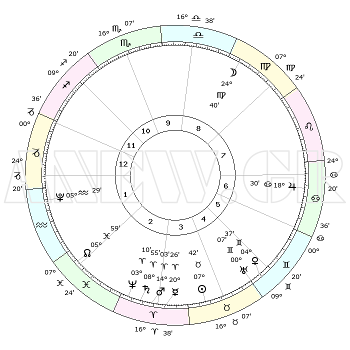 | | ΘΕΣΕΙΣ ΠΛΑΝΗΤΩΝ ΑΣΤΡΟΛΟΓΙΚΟΥ ΧΑΡΤΗ ΤΗΣ ΣΤΙΓΜΗΣ ΑΥΤΗΣ | | | | Πλανήτης | Ζώδιο | Μοίρες | Δεκαήμ. | Σε οίκο | Απόκλιση | | Ακμές των οίκων | | Ηλιος | Ταύρος | 07°38' | Πρώτο | 4 | 14 N 03 | | 1ος | 03°21' | Αιγόκερως | | Σελήνη | Παρθένος | 23°57' | Τρίτο | 9 | 01 N 04 | | 2ος | 11°21' | Υδροχόος | | Ερμής | Κριός | 20°20' | Τρίτο | 3 | 05 N 53 | | 3ος | 21°33' | Ιχθείς | | Αφροδίτη | Δίδυμοι | 04°32' | Πρώτο | 5 | 21 N 47 | | 4ος | 24°56' | Κριός | | Αρης | Κριός | 14°00' | Δεύτερο | 3 | 04 N 41 | | 5ος | 20°43' | Ταύρος | | Δίας | Καρκίνος | 18°30' | Δεύτερο | 7 | 22 N 32 | | 6ος | 12°20' | Δίδυμοι | | Κρόνος | Κριός | 08°54' | Πρώτο | 3 | 01 N 32 | | 7ος | 03°21' | Καρκίνος | | Ουρανός | Δίδυμοι | 00°06' | Πρώτο | 5 | 20 N 00 | | 8ος | 11°21' | Λέων | | Ποσειδώνας | Κριός | 03°10' | Πρώτο | 3 | 00 N 03 | | 9ος | 21°33' | Παρθένος | | Πλούτωνας | Υδροχόος | 05°29' | Πρώτο | 1 | 22 S 48 | | 10ος | 24°56' | Ζυγός | | Β. Δεσμός | Ιχθείς | 05°59' | Πρώτο | 2 | 09 S 19 | | 11ος | 20°43' | Σκορπιός | | Ωροσκόπος | Αιγόκερως | 03°21' | Πρώτο | | | 12ος | 12°19' | Τοξότης | | Μεσουράνημα | Ζυγός | 24°56' | Τρίτο | | | |