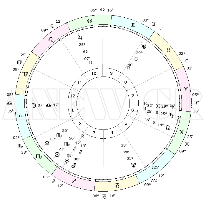 | | ΘΕΣΕΙΣ ΠΛΑΝΗΤΩΝ ΑΣΤΡΟΛΟΓΙΚΟΥ ΧΑΡΤΗ ΤΗΣ ΣΤΙΓΜΗΣ ΑΥΤΗΣ | | | | Πλανήτης | Ζώδιο | Μοίρες | Δεκαήμ. | Σε οίκο | Απόκλιση | | Ακμές των οίκων | | Ηλιος | Σκορπιός | 23°52' | Τρίτο | 3 | 18 S 44 | | 1ος | 19°24' | Παρθένος | | Σελήνη | Ζυγός | 07°08' | Πρώτο | 1 | 04 S 30 | | 2ος | 15°09' | Ζυγός | | Ερμής | Τοξότης | 03°45'R | Πρώτο | 3 | 21 S 48 | | 3ος | 15°08' | Σκορπιός | | Αφροδίτη | Σκορπιός | 11°21' | Δεύτερο | 2 | 14 S 07 | | 4ος | 18°04' | Τοξότης | | Αρης | Τοξότης | 08°17' | Πρώτο | 3 | 22 S 12 | | 5ος | 21°16' | Αιγόκερως | | Δίας | Καρκίνος | 25°07'R | Τρίτο | 11 | 21 N 13 | | 6ος | 22°07' | Υδροχόος | | Κρόνος | Ιχθείς | 25°25'R | Τρίτο | 7 | 04 S 03 | | 7ος | 19°24' | Ιχθείς | | Ουρανός | Ταύρος | 29°40'R | Τρίτο | 9 | 19 N 52 | | 8ος | 15°09' | Κριός | | Ποσειδώνας | Ιχθείς | 29°32'R | Τρίτο | 7 | 01 S 26 | | 9ος | 15°08' | Ταύρος | | Πλούτωνας | Υδροχόος | 01°38' | Πρώτο | 5 | 23 S 28 | | 10ος | 18°04' | Δίδυμοι | | Β. Δεσμός | Ιχθείς | 14°36' | Δεύτερο | 6 | 06 S 04 | | 11ος | 21°16' | Καρκίνος | | Ωροσκόπος | Παρθένος | 19°24' | Δεύτερο | | | 12ος | 22°07' | Λέων | | Μεσουράνημα | Δίδυμοι | 18°04' | Δεύτερο | | | |