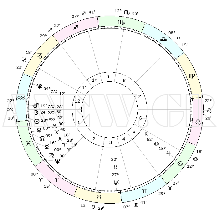 | | ΘΕΣΕΙΣ ΠΛΑΝΗΤΩΝ ΑΣΤΡΟΛΟΓΙΚΟΥ ΧΑΡΤΗ ΤΗΣ ΣΤΙΓΜΗΣ ΑΥΤΗΣ | | | | Πλανήτης | Ζώδιο | Μοίρες | Δεκαήμ. | Σε οίκο | Απόκλιση | | Ακμές των οίκων | | Ηλιος | Υδροχόος | 28°28' | Τρίτο | 1 | 12 S 00 | | 1ος | 22°03' | Αιγόκερως | | Σελήνη | Υδροχόος | 24°07' | Τρίτο | 1 | 14 S 46 | | 2ος | 04°38' | Ιχθείς | | Ερμής | Ιχθείς | 16°13' | Δεύτερο | 2 | 04 S 56 | | 3ος | 14°09' | Κριός | | Αφροδίτη | Ιχθείς | 08°25' | Πρώτο | 2 | 09 S 46 | | 4ος | 14°03' | Ταύρος | | Αρης | Υδροχόος | 19°25' | Δεύτερο | 1 | 16 S 01 | | 5ος | 07°29' | Δίδυμοι | | Δίας | Καρκίνος | 15°52'R | Δεύτερο | 6 | 22 N 49 | | 6ος | 28°43' | Δίδυμοι | | Κρόνος | Κριός | 00°28' | Πρώτο | 2 | 01 S 47 | | 7ος | 22°03' | Καρκίνος | | Ουρανός | Ταύρος | 27°32' | Τρίτο | 4 | 19 N 26 | | 8ος | 04°38' | Παρθένος | | Ποσειδώνας | Κριός | 00°38' | Πρώτο | 2 | 00 S 57 | | 9ος | 14°09' | Ζυγός | | Πλούτωνας | Υδροχόος | 04°12' | Πρώτο | 1 | 22 S 56 | | 10ος | 14°03' | Σκορπιός | | Β. Δεσμός | Ιχθείς | 09°40' | Πρώτο | 2 | 07 S 56 | | 11ος | 07°29' | Τοξότης | | Ωροσκόπος | Αιγόκερως | 22°03' | Τρίτο | | | 12ος | 28°43' | Τοξότης | | Μεσουράνημα | Σκορπιός | 14°03' | Δεύτερο | | | |