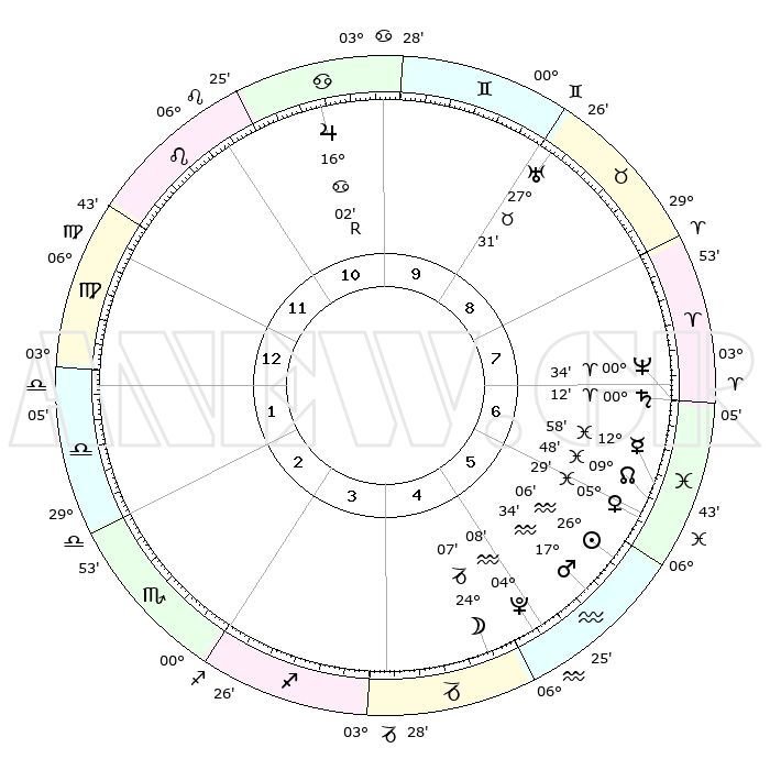 | | ΘΕΣΕΙΣ ΠΛΑΝΗΤΩΝ ΑΣΤΡΟΛΟΓΙΚΟΥ ΧΑΡΤΗ ΤΗΣ ΣΤΙΓΜΗΣ ΑΥΤΗΣ | | | | Πλανήτης | Ζώδιο | Μοίρες | Δεκαήμ. | Σε οίκο | Απόκλιση | | Ακμές των οίκων | | Ηλιος | Υδροχόος | 26°02' | Τρίτο | 6 | 12 S 50 | | 1ος | 14°28' | Παρθένος | | Σελήνη | Αιγόκερως | 23°20' | Τρίτο | 5 | 25 S 08 | | 2ος | 09°46' | Ζυγός | | Ερμής | Ιχθείς | 12°53' | Δεύτερο | 6 | 06 S 44 | | 3ος | 09°29' | Σκορπιός | | Αφροδίτη | Ιχθείς | 05°24' | Πρώτο | 6 | 10 S 54 | | 4ος | 12°26' | Τοξότης | | Αρης | Υδροχόος | 17°31' | Δεύτερο | 6 | 16 S 36 | | 5ος | 15°49' | Αιγόκερως | | Δίας | Καρκίνος | 16°03'R | Δεύτερο | 11 | 22 N 48 | | 6ος | 16°53' | Υδροχόος | | Κρόνος | Κριός | 00°12' | Πρώτο | 7 | 01 S 54 | | 7ος | 14°28' | Ιχθείς | | Ουρανός | Ταύρος | 27°30' | Τρίτο | 9 | 19 N 25 | | 8ος | 09°46' | Κριός | | Ποσειδώνας | Κριός | 00°33' | Πρώτο | 7 | 00 S 59 | | 9ος | 09°29' | Ταύρος | | Πλούτωνας | Υδροχόος | 04°08' | Πρώτο | 5 | 22 S 57 | | 10ος | 12°26' | Δίδυμοι | | Β. Δεσμός | Ιχθείς | 09°48' | Πρώτο | 6 | 07 S 54 | | 11ος | 15°49' | Καρκίνος | | Ωροσκόπος | Παρθένος | 14°28' | Δεύτερο | | | 12ος | 16°53' | Λέων | | Μεσουράνημα | Δίδυμοι | 12°26' | Δεύτερο | | | |