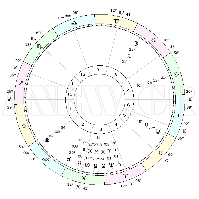 | | ΘΕΣΕΙΣ ΠΛΑΝΗΤΩΝ ΑΣΤΡΟΛΟΓΙΚΟΥ ΧΑΡΤΗ ΤΗΣ ΣΤΙΓΜΗΣ ΑΥΤΗΣ | | | | Πλανήτης | Ζώδιο | Μοίρες | Δεκαήμ. | Σε οίκο | Απόκλιση | | Ακμές των οίκων | | Ηλιος | Ιχθείς | 11°24' | Δεύτερο | 3 | 07 S 17 | | 1ος | 13°12' | Τοξότης | | Σελήνη | Λέων | 22°45' | Τρίτο | 8 | 15 N 19 | | 2ος | 16°31' | Αιγόκερως | | Ερμής | Ιχθείς | 21°29'R | Τρίτο | 3 | 00 S 13 | | 3ος | 24°26' | Υδροχόος | | Αφροδίτη | Ιχθείς | 24°28' | Τρίτο | 3 | 03 S 26 | | 4ος | 00°16' | Κριός | | Αρης | Υδροχόος | 29°32' | Τρίτο | 3 | 12 S 39 | | 5ος | 29°23' | Κριός | | Δίας | Καρκίνος | 15°13'R | Δεύτερο | 7 | 22 N 54 | | 6ος | 22°44' | Ταύρος | | Κρόνος | Κριός | 01°57' | Πρώτο | 4 | 01 S 11 | | 7ος | 13°12' | Δίδυμοι | | Ουρανός | Ταύρος | 27°45' | Τρίτο | 6 | 19 N 29 | | 8ος | 16°31' | Καρκίνος | | Ποσειδώνας | Κριός | 01°05' | Πρώτο | 4 | 00 S 46 | | 9ος | 24°26' | Λέων | | Πλούτωνας | Υδροχόος | 04°34' | Πρώτο | 2 | 22 S 52 | | 10ος | 00°16' | Ζυγός | | Β. Δεσμός | Ιχθείς | 08°60' | Πρώτο | 3 | 08 S 12 | | 11ος | 29°23' | Ζυγός | | Ωροσκόπος | Τοξότης | 13°12' | Δεύτερο | | | 12ος | 22°44' | Σκορπιός | | Μεσουράνημα | Ζυγός | 00°16' | Πρώτο | | | |