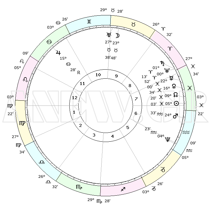| | ΘΕΣΕΙΣ ΠΛΑΝΗΤΩΝ ΑΣΤΡΟΛΟΓΙΚΟΥ ΧΑΡΤΗ ΤΗΣ ΣΤΙΓΜΗΣ ΑΥΤΗΣ | | | | Πλανήτης | Ζώδιο | Μοίρες | Δεκαήμ. | Σε οίκο | Απόκλιση | | Ακμές των οίκων | | Ηλιος | Ιχθείς | 04°59' | Πρώτο | 7 | 09 S 41 | | 1ος | 13°01' | Λέων | | Σελήνη | Ταύρος | 22°48' | Τρίτο | 10 | 23 N 22 | | 2ος | 05°07' | Παρθένος | | Ερμής | Ιχθείς | 21°59' | Τρίτο | 8 | 01 S 12 | | 3ος | 01°55' | Ζυγός | | Αφροδίτη | Ιχθείς | 16°29' | Δεύτερο | 8 | 06 S 39 | | 4ος | 04°12' | Σκορπιός | | Αρης | Υδροχόος | 24°30' | Τρίτο | 7 | 14 S 23 | | 5ος | 09°37' | Τοξότης | | Δίας | Καρκίνος | 15°29'R | Δεύτερο | 12 | 22 N 52 | | 6ος | 13°21' | Αιγόκερως | | Κρόνος | Κριός | 01°12' | Πρώτο | 8 | 01 S 29 | | 7ος | 13°01' | Υδροχόος | | Ουρανός | Ταύρος | 27°38' | Τρίτο | 10 | 19 N 27 | | 8ος | 05°07' | Ιχθείς | | Ποσειδώνας | Κριός | 00°51' | Πρώτο | 8 | 00 S 52 | | 9ος | 01°55' | Κριός | | Πλούτωνας | Υδροχόος | 04°23' | Πρώτο | 6 | 22 S 54 | | 10ος | 04°12' | Ταύρος | | Β. Δεσμός | Ιχθείς | 09°20' | Πρώτο | 8 | 08 S 04 | | 11ος | 09°37' | Δίδυμοι | | Ωροσκόπος | Λέων | 13°01' | Δεύτερο | | | 12ος | 13°21' | Καρκίνος | | Μεσουράνημα | Ταύρος | 04°12' | Πρώτο | | | |